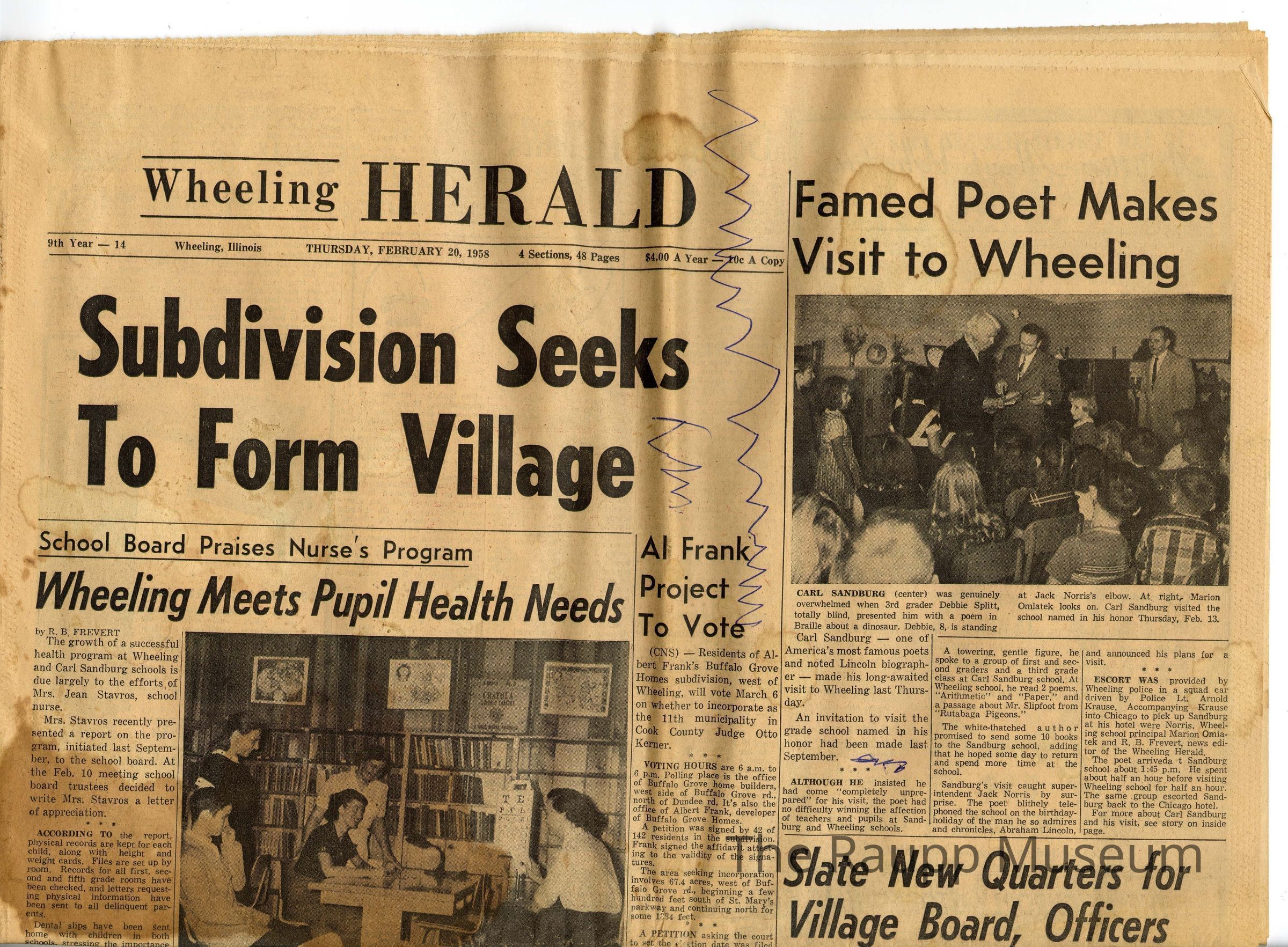 The Wheeling Herald 9th year, 14th edition newspaper from February 20, 1958, with the headline "Subdivision Seeks to Form Village: Al Frank Project to Vote". Article talks about Al Franks work trying to form the Village of Buffalo Grove.Publication Details