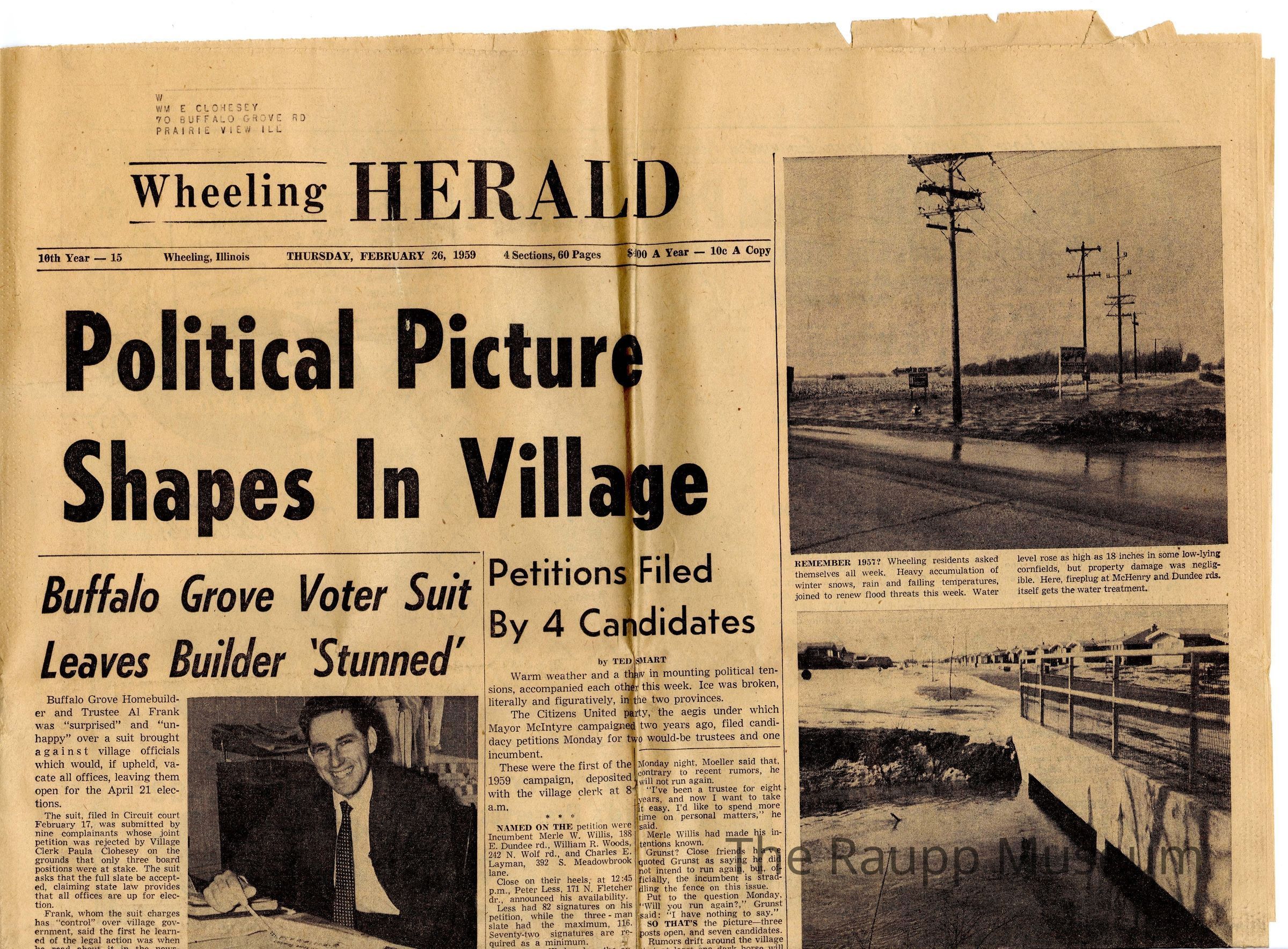 The Wheeling Herald 10th year, 15th edition newspaper from February 26, 1959, with the headline "Political Picture Shapes in Village". Article on front page with title "Buffalo Grove Voter Suit Leaves Builder 'Stunned'", with a picture of Al Frank.Publication Details