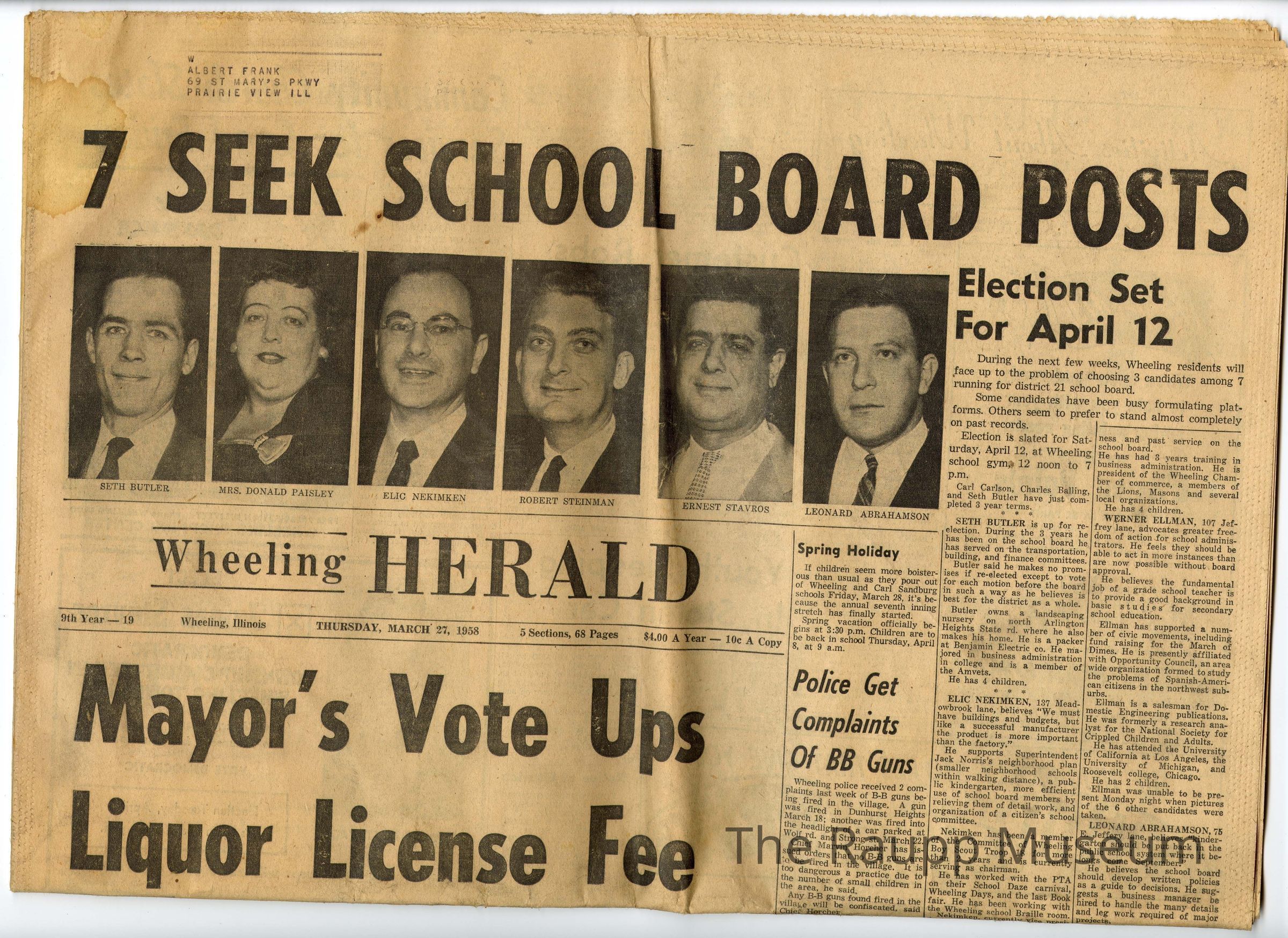 The Wheeling Herald Newspaper 9th Year, Number 19 from Thursday, March 27, 1958. Headling article is" Mayor's Vote Ups Liquor License Fee". Paper features articles about Buffalo Grove as well, including an article on the bottom of the front page titled "Buffalo Grove to Elect Village Officials Today".Publication Details