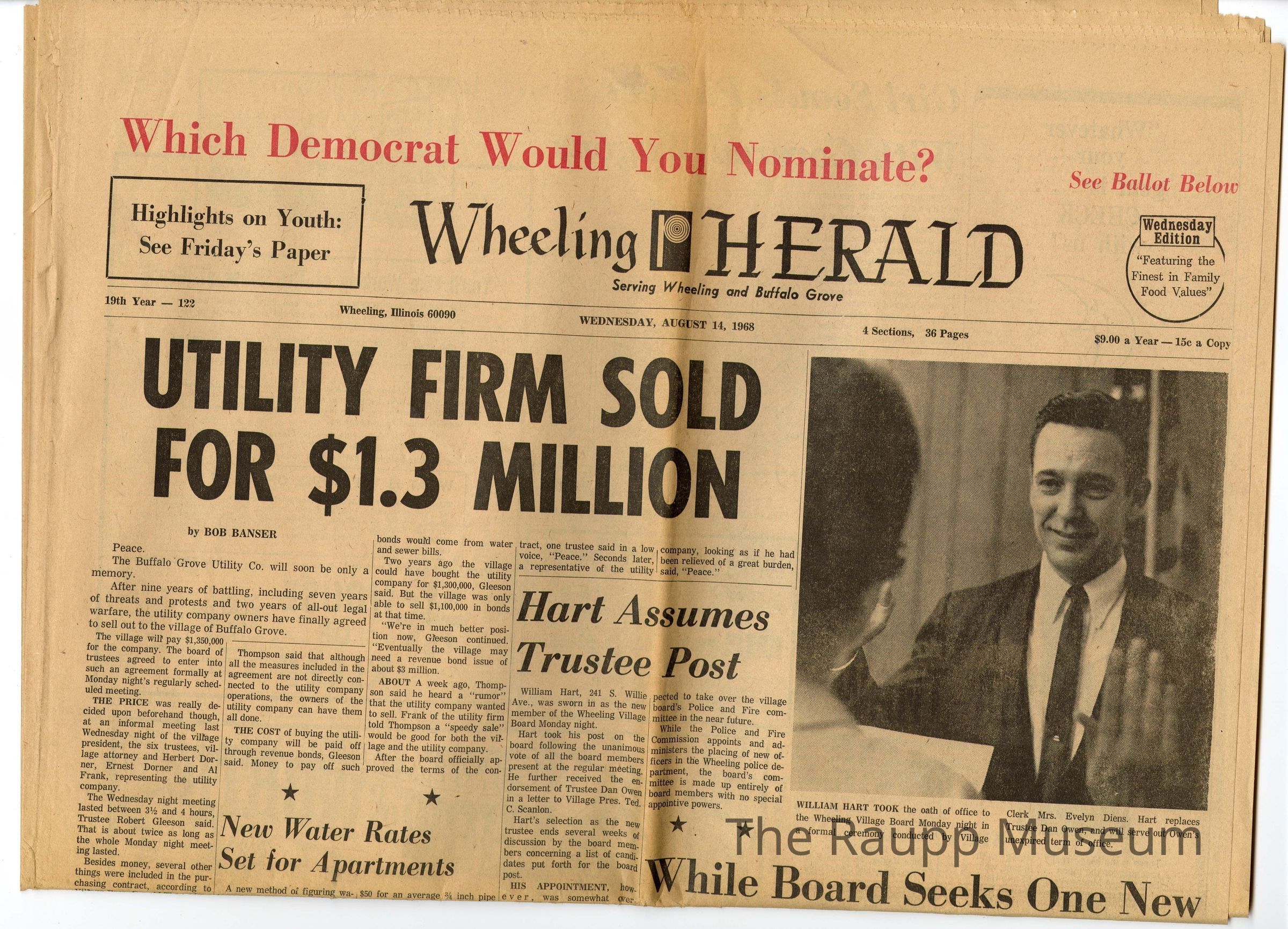 The Wheeling Herald Newspaper 19th Year, Number 122 from August 14, 1968. Headling is "Utility Firm Sold for $1.3 Million". Article talks about the selling of the Buffalo Grove Utility Company to the Village of BG.Publication Details