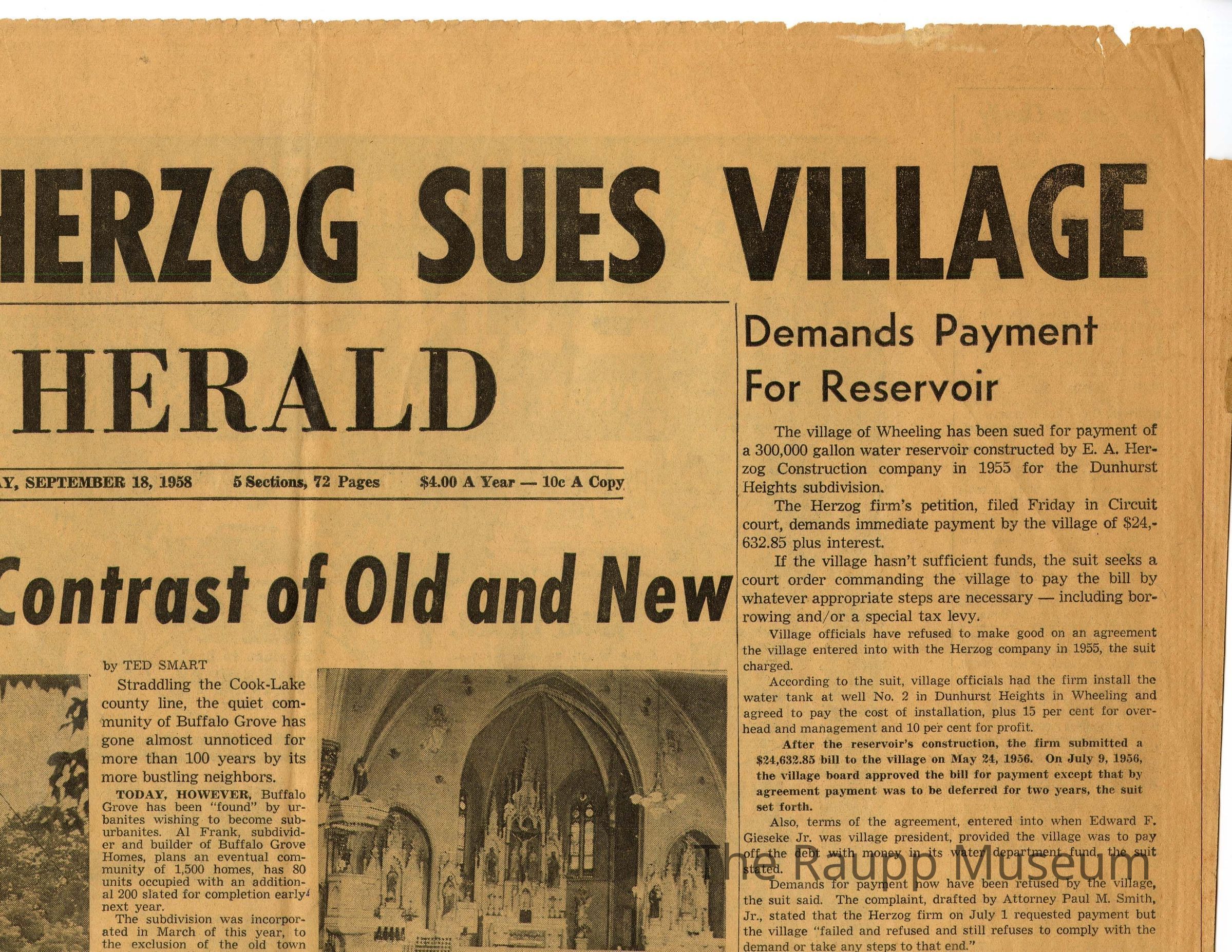 One (1) front page for the Wheeling Herald 9th Year, Number 44 from September 18, 1958. On the front of page is the title article "Buffalo Grove - a Constrast of Old and New", with 4 pictures around Buffalo Grove, including over the creek, St. Marys Church and new construction.Publication Details