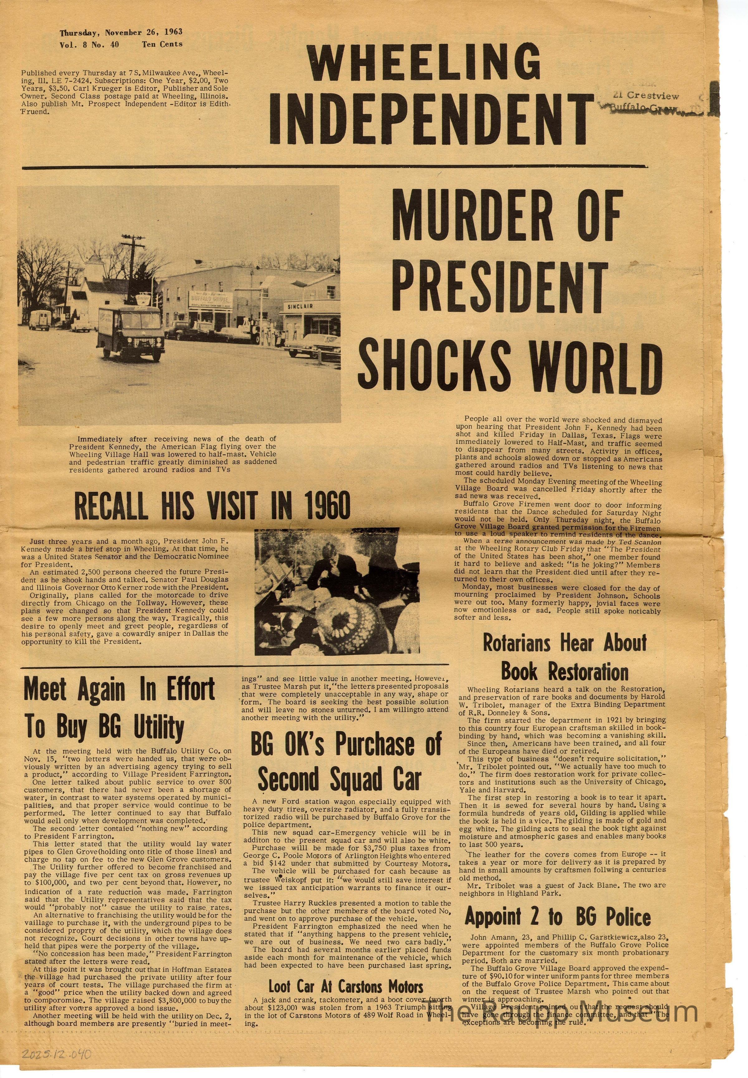 The Wheeling Independent Vol. 8, No. 40 newspaper from November 26, 1963, featuring the headline "Murder of President Shocks World". There are multiple articles related to Buffalo Grove in this issue, including "Meet again in Effort to Buy BG Utility", "BG OK's Purchase of Second Squad Car", " and "Appoint 2 to BG Police". The cover also features a photograph of Wheeling Village Hall, and a billboard advertising BG homes out front.Publication Details