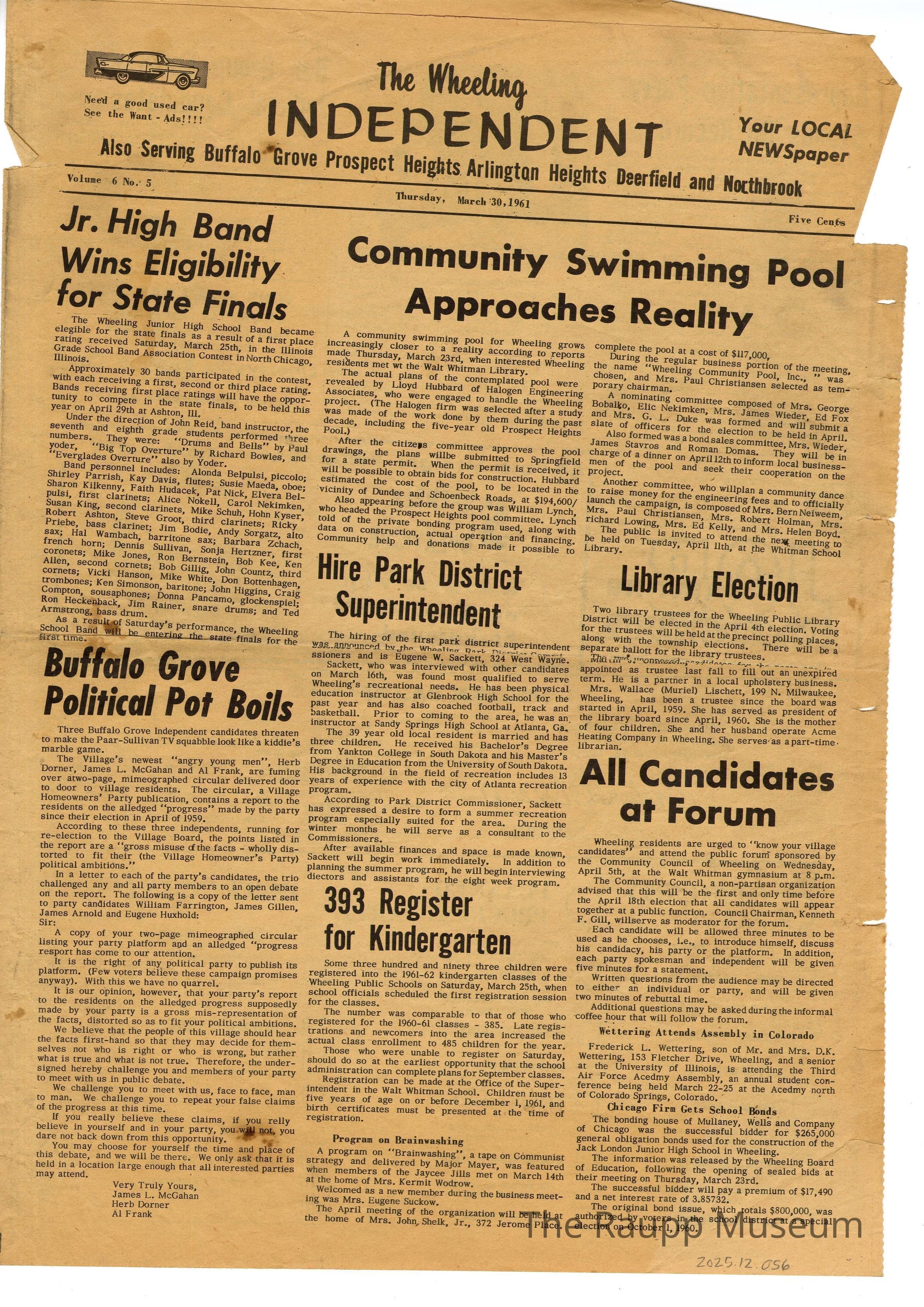 The Wheeling Independent Newspaper Volume 6, Number 5 from March 30, 1961. Title article reads"Community Swimming Pool Approaches Reality". There is an article in bottom left corner titled "Buffalo Grove Political Pot Boils" written by candidates James McGahan, Herb Dorner, and Al Frank.Publication Details