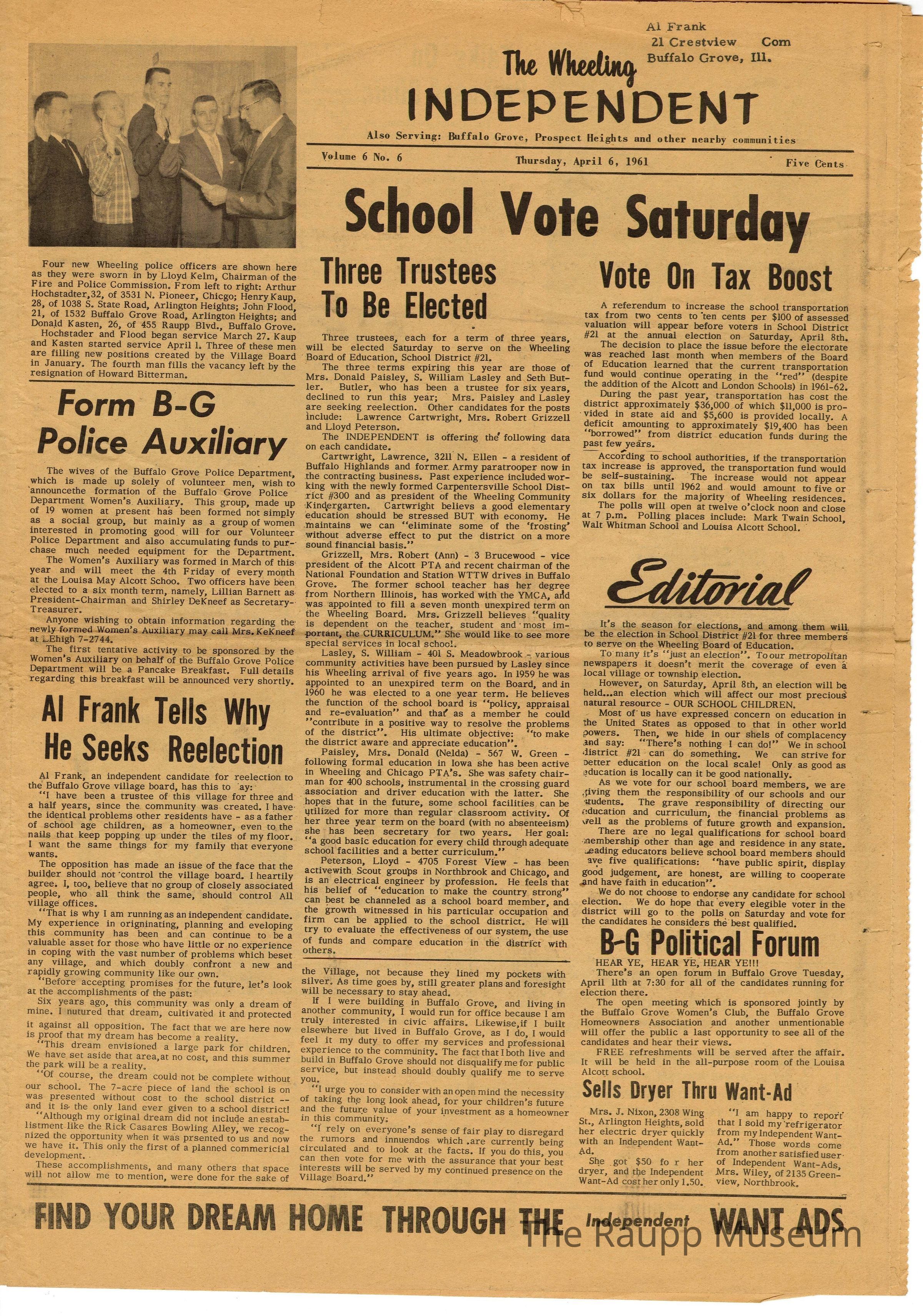 The Wheeling Independent Newspaper Volume 6, Number 6 from April 6, 1961. Headline reads "School Vote Saturday". There was multiple articles concerning Buffalo Grove, including "Form B-G Police Auxiliary", "B-G Political Forum", and "Al Frank Tells Why He Seeks Reelection".Publication Details