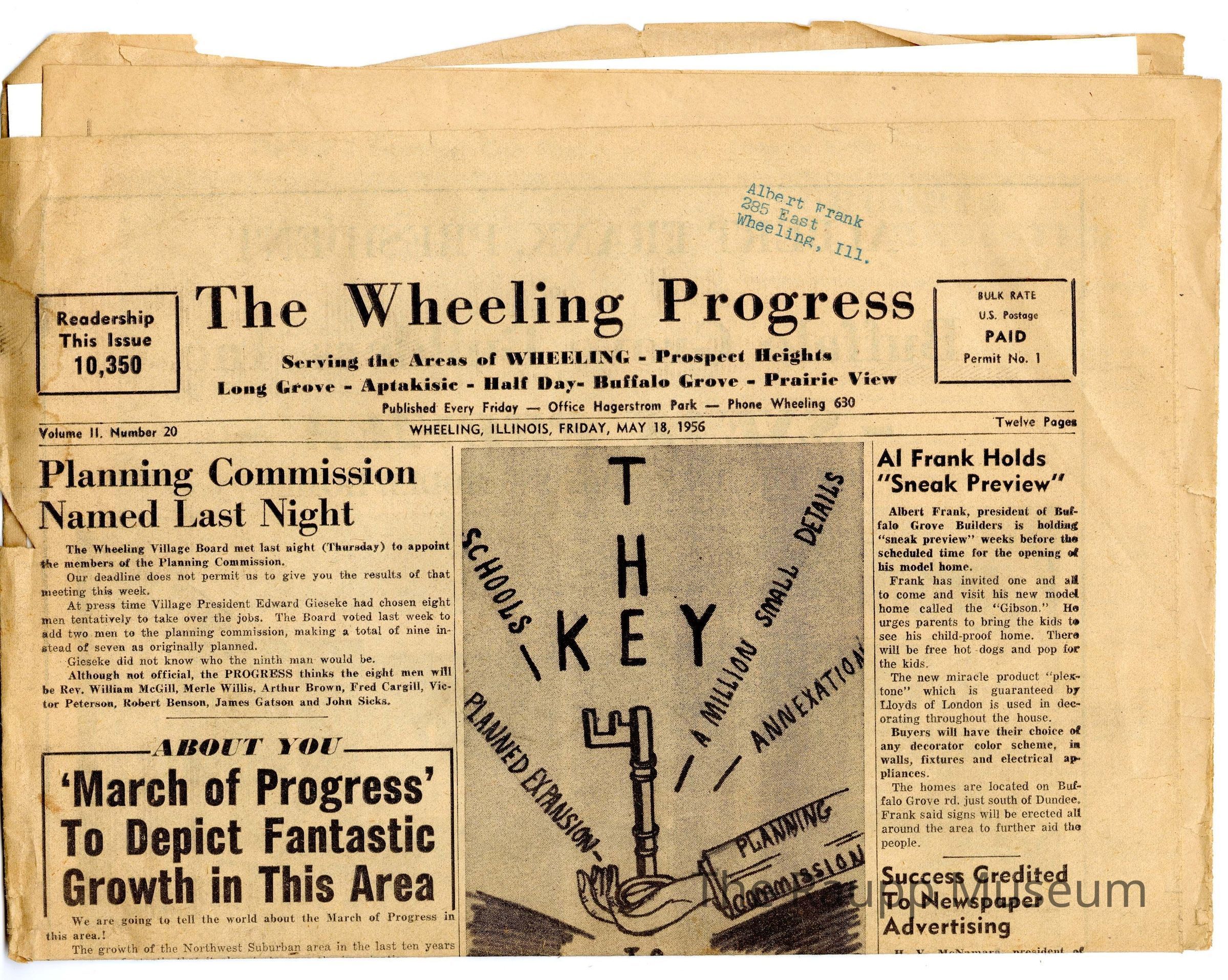 The Wheeling Progress Newspaper Vol. 2, Number 30 from May 18, 1956. Headline article is "Planning Commission Named Last Night". There is an article on front page right side titled "Al Frank Holds "Sneak Preview"", about an event of the new homes Al Frank built in Buffalo Grove.Publication Details