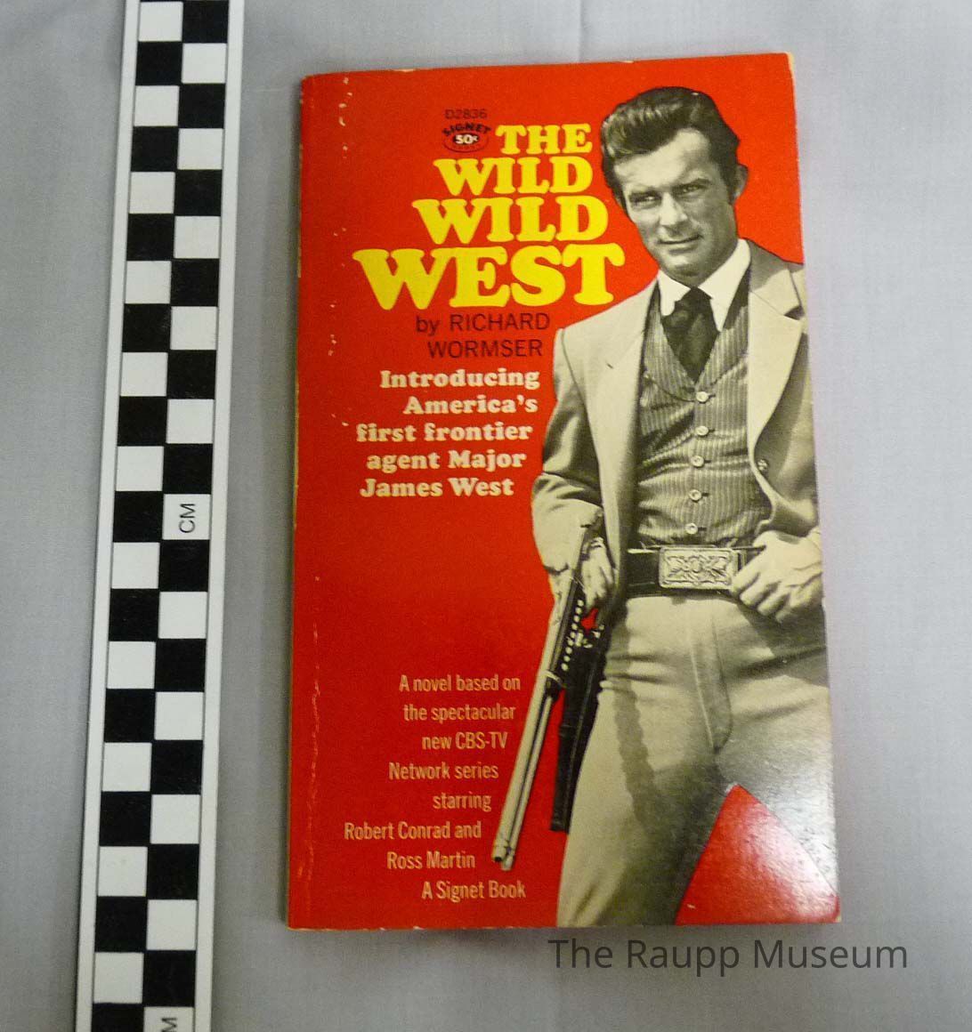 One (1) novel titled "The Wild Wild West" by Richard Wormser. The novel is about an undercover agent for the US Government under Grant, that investigates crime in the West. Cover has a man in black and white holding a large shotgun, in a suit, with a red background.Book Details