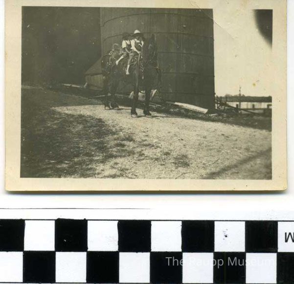 Black and white print with white border. Image of two children seated on a horse in front of a barn silo. Both children wearing hats and overalls. reverse side has number "76" stamped in lower right corner.Dimensions