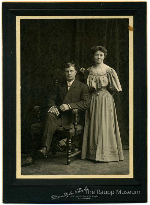 Black and white photographic print mounted to a gray card with white border. Photographer studio information on the front edge of lower card border. Portrait image of Theodore Weidner and Anna Schmidt. Theodore is wearing a suit with white bow tie, seated in a chair with his leg crossed, ring visible on his left hand. Anna is standing on the right wearing a long dress with puffed sleeves and shirt front with lace yoke and high collar. She is also wearing a long necklace with watch fob pendant. Tapestry curtain backdrop behind them. reverse ink inscription: "Theo. Weidner & Wife."Relationships