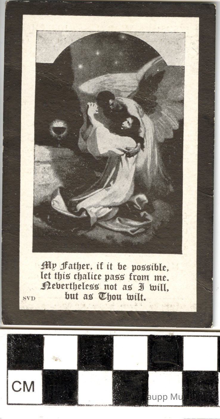 One (1) mourning prayer card for Theresa C. Biere, born 05/19/1902, died 9/3/1952. On one side of the card is a prayer and obituary in English. On the other side is a picture of Jesus on his knees prayer to God, with his hands lifted upward and an angle holding him from behind. There is a chalice to his right. underneath is a religious saying.