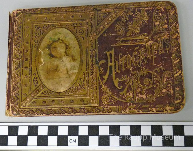 Reverse cover has embossed geometric pattern. Pages contain autographs and poems from (Mary?) Theresa Nickol's friends. Several have local family surnames.