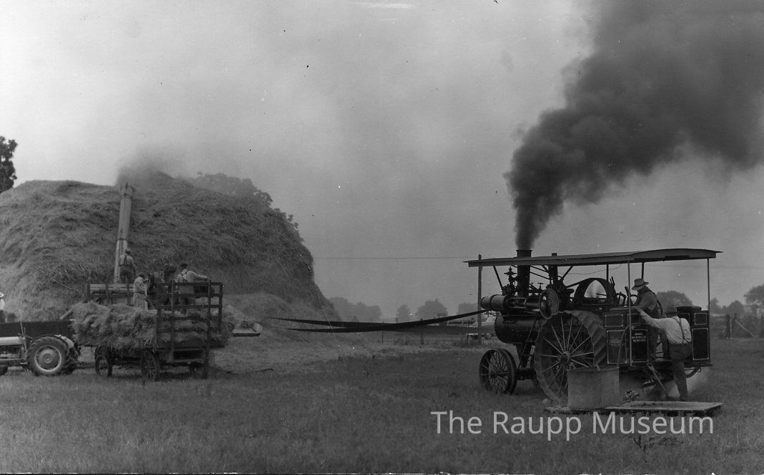 Black and white postcard with glossy front. Image of men thrashing in Saline, Michigan. Two men on a steam tractor. Another three men on the left in the cart attached to a different small tractor. A mound on the left that the three men are working on. Steam coming out of the tractor on the right. reverse side has Kodak postcard text.Dimensions