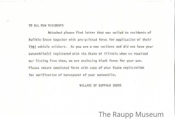 Photocopied document printed on half letter size paper. Typed black and white paragraph for orienting new residents about packet contents and inclosed automobile registration forms. Signed "Village of Buffalo Grove."Archive Details