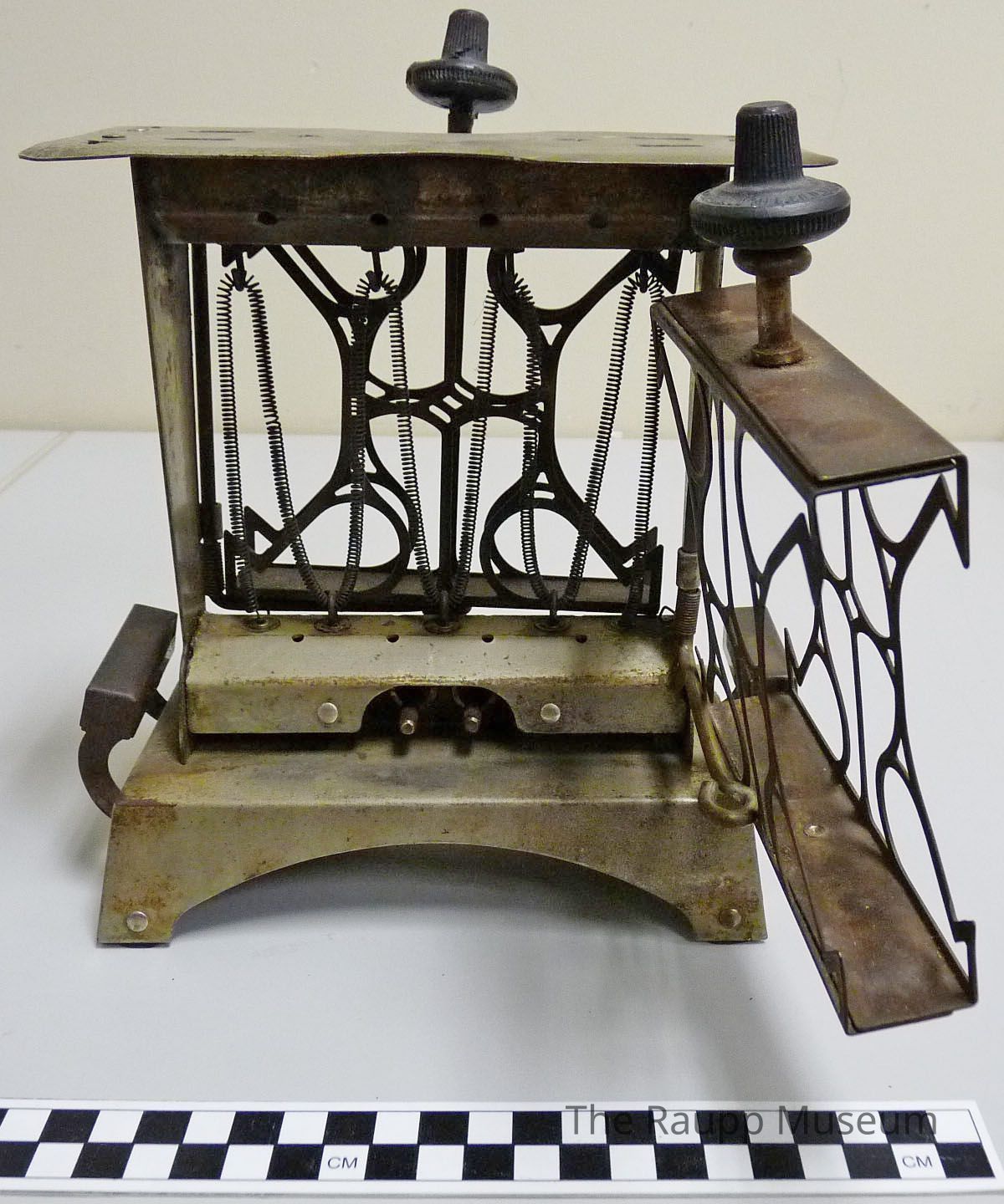 Electric toaster with exposed heating coils. Four-footed, arched metal base with slim metal handles; holds a platformed heating unit inserted into the base and attached with metal fixture. Unit has two caged panel arms and a two-prong electric element. Each arm has an art deco style cage to hold a piece of bread against the heating coils. A Bakelite knob on top of each panel is used to swing the panel around to toast the bread on the other side. Knobs have embossed logo information on them. Metal plate on top of the unit has a star shaped perforation in each corner.Dimensions