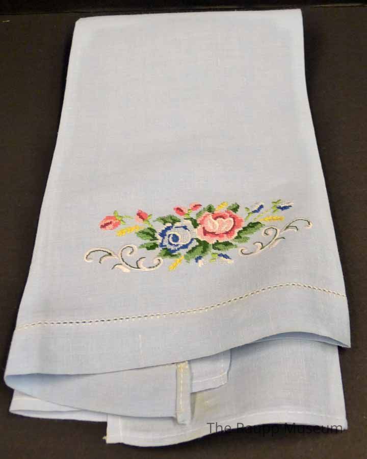Blue linen tea towel with hand embroidered embellishment of pink and blue roses. With a white hemstitch along bottom edge.