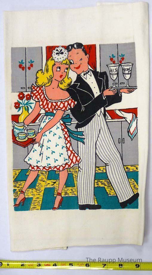 White cotton tea towel with color graphic. Image of cartoon characters Blondie and Dagwood standing in a kitchen. Blondie wears a red dress and carries a tea service, Dagwood wears a tuxedo and carries a tray of “his and her” drinks.