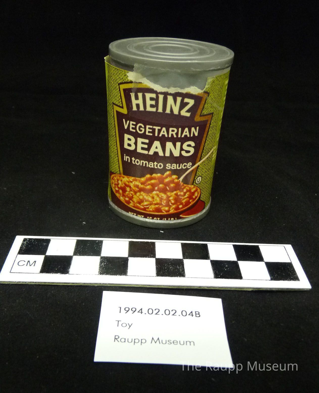 One (1) plastic and paper replica miniature can of food. Can is grey plastic with green label, wrapped around the can, for Heinz vegetarian beans in tomato sauce. Identical to 1994.02.02.04A.Dimensions