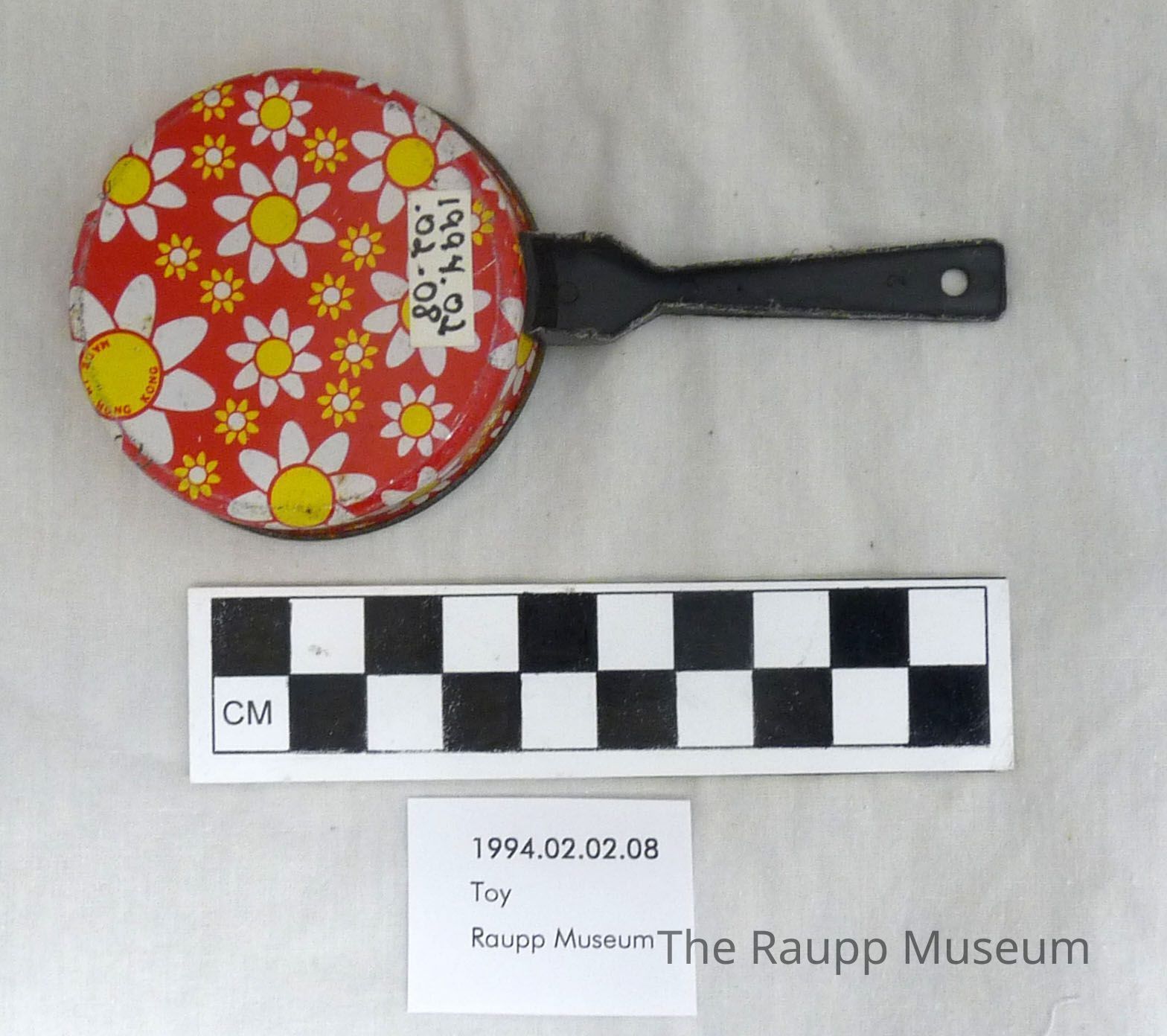 One (1) red, yellow, and white aluminum toy skillet with a plastic black handle that is 2.5" long. Red/White/Yellow flowers printed on the outside of the pan. Handle has a hole in the end of it. "Made in Hong Kong" marked on pan.Dimensions