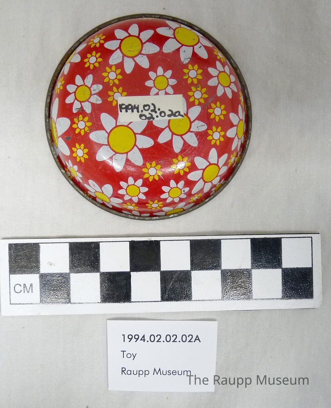One (1) silver, red, white, and yellow tin toy bowl. Tin bowl used as part of toy kitchen cabinet, has silver inside and red outside, printed with white and yellow flower design. "Made in Hong Kong" printed in center of flower on side of bowl.Dimensions