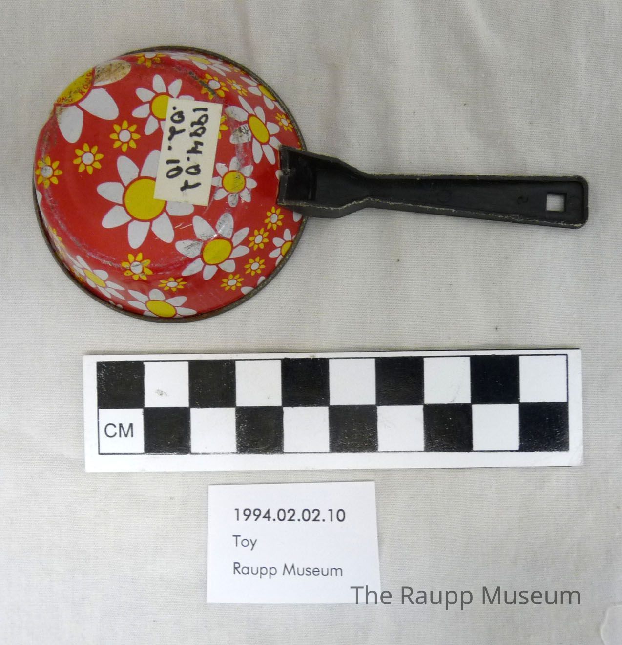 One (1) red, yellow, and white aluminum toy skillet with a plastic black handle. Red/White/Yellow flowers printed on the outside of the pan. "Made in Hong Kong" marked on outside of pan.Dimensions