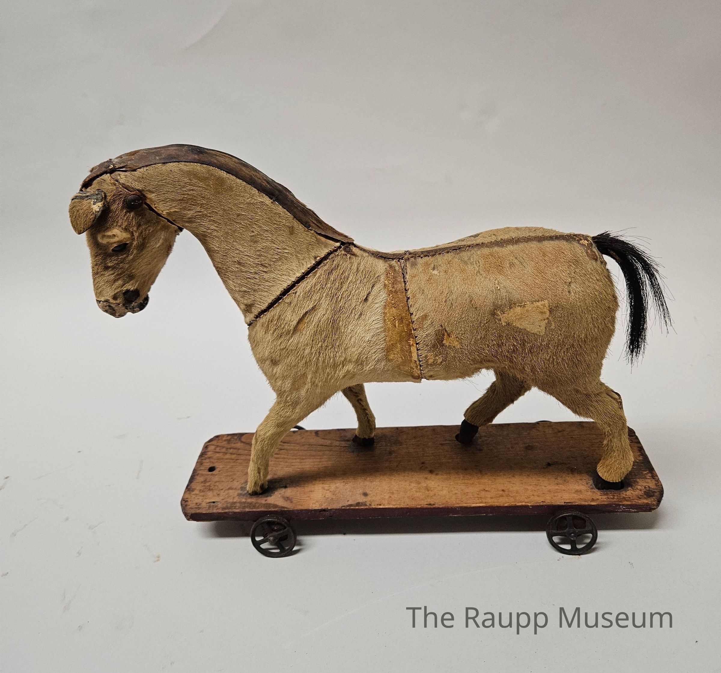 Back horse or cow tail hair is used for the horse's tail. The horse has no eyes in the eye sockets, and there are two metal nails on the sides of the head. There is a hole on the front base of the board (possibly for a rope or pull mechanism to the attached).Made/Created
