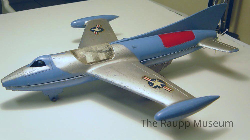 Plastic toy jet airplane. Hand-painted silver, with light blue, red and white. Adhesive decals on the wings feature a star over a circle and five stripes. Plastic plane hatch is discolored. Plane is broken into two parts: upper and base, are not currently attached to each other.Dimensions