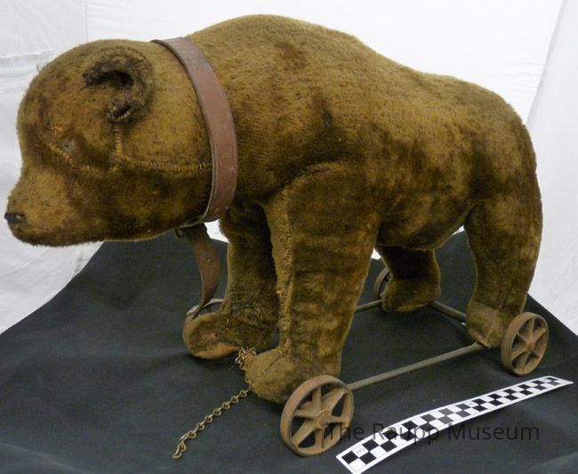 Brown stuffed bear mounted on metal base with wheels. Has a center seam and is stuffed with wood chips, wearing a brown leather collar and rusty chain pull. Bear is missing eyes and is very likely a Steiff. This model was produced as early as 1892 and metal wheels were used until 1920 when replaced with wood in 1921.Dimensions