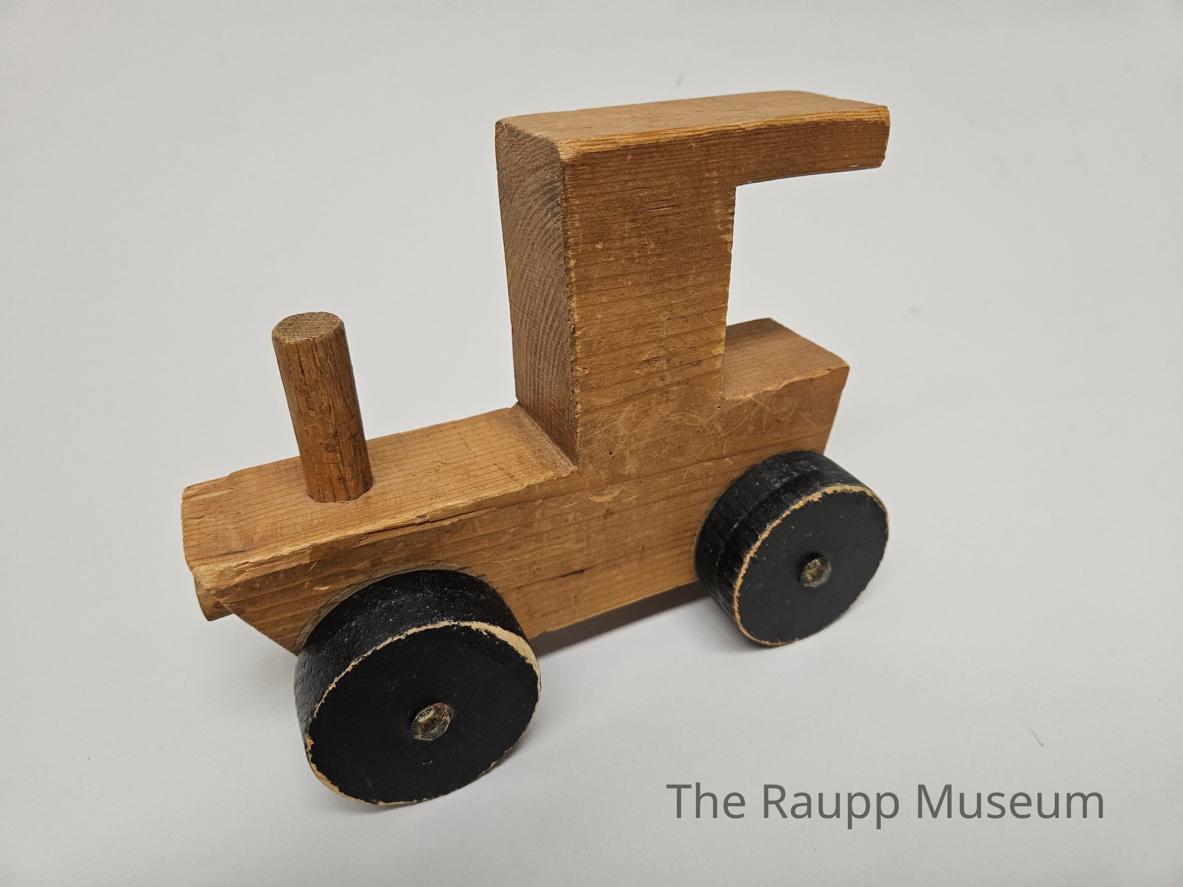 Four (4) black painted wheels held in place by a metal rivet each to a wood dowel axle to the side of the body, two (2) on each side.Dimensions