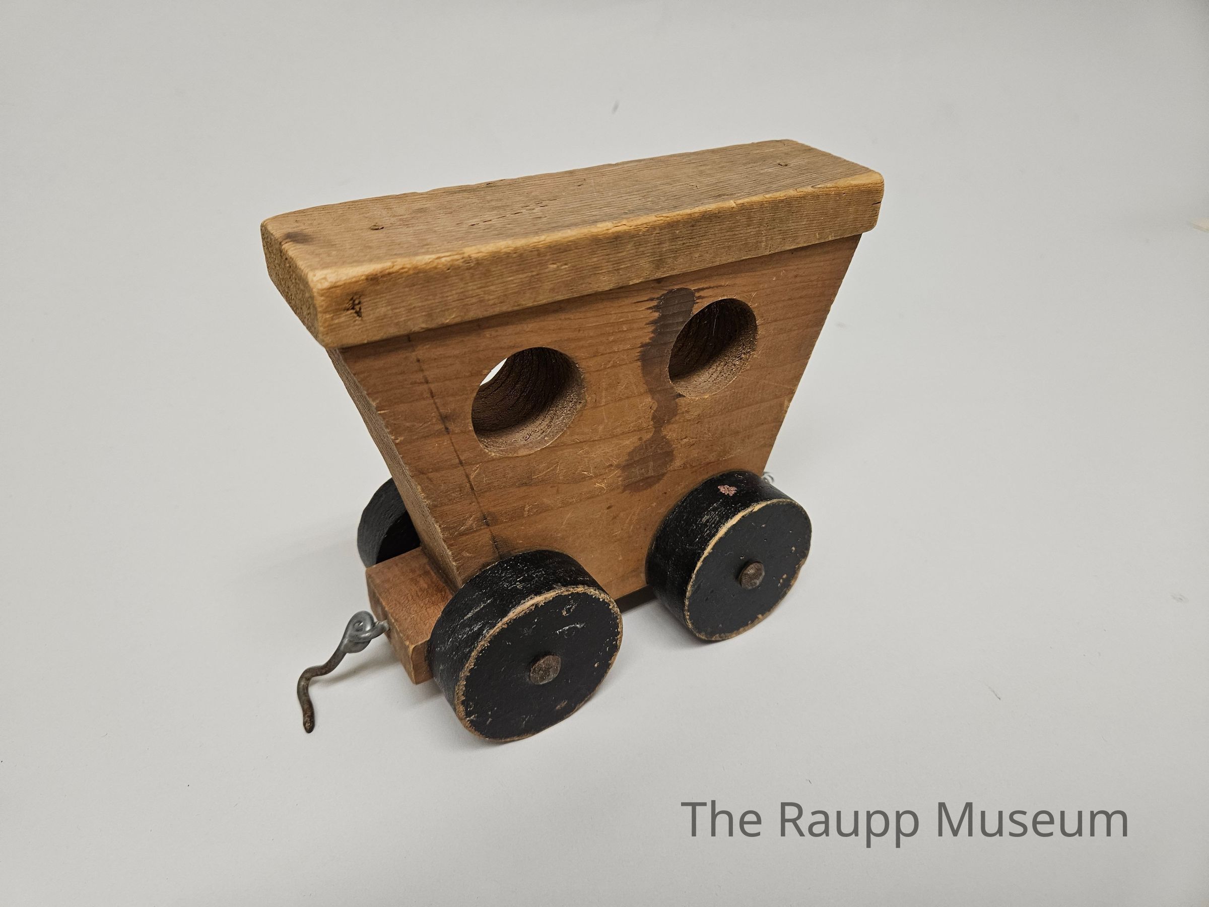 Four (4) black painted wheels held in place by a metal rivet each to a wood dowel axle to the side of the body, two (2) on each side.Dimensions