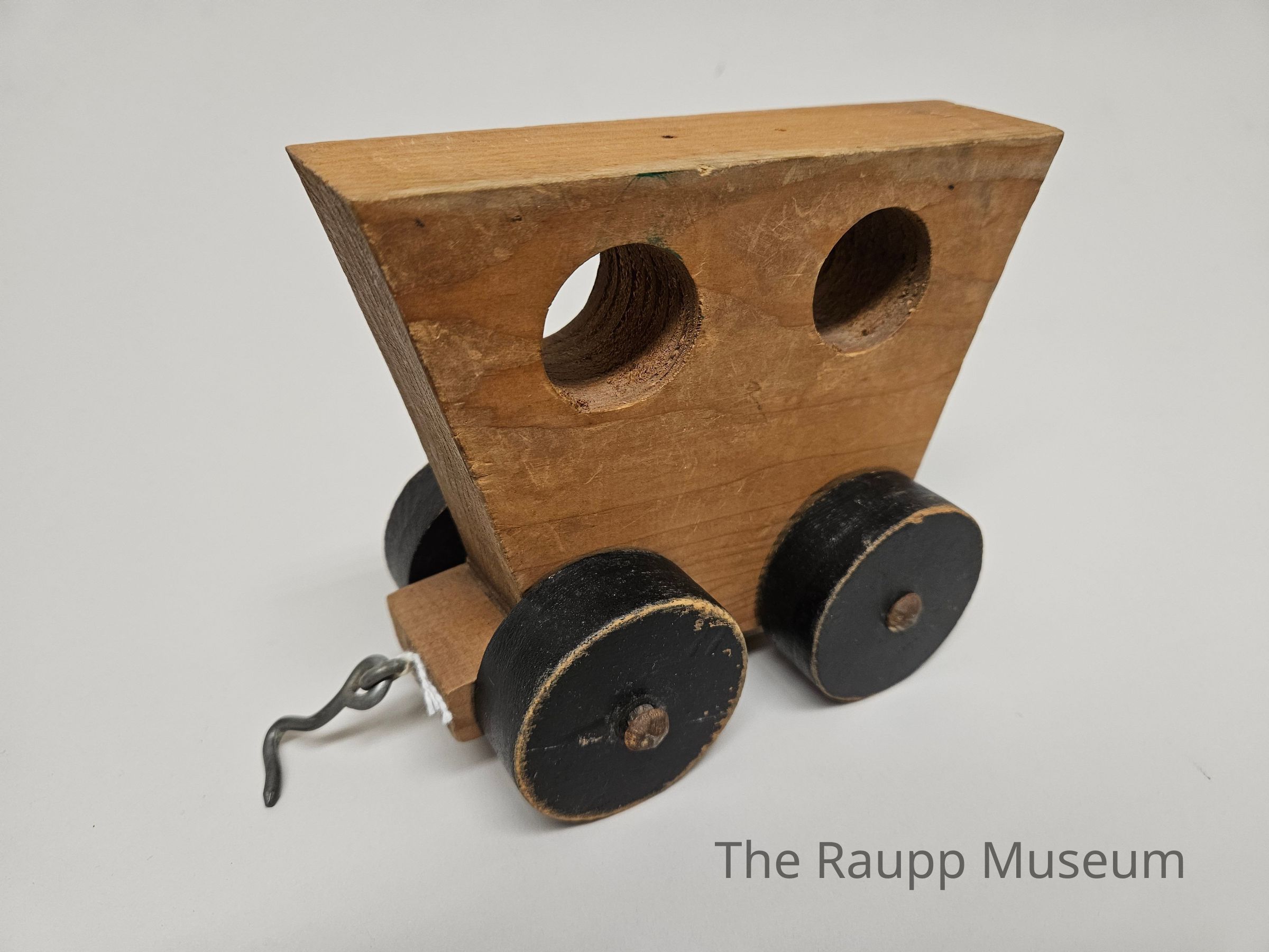 One (1) car for a wooden toy train. Car is cut from a single board in a trapezoid shape, narrow side down. Two (2) 1 1/4" holes are bored through the upper third section. The front side has a small platform with a metal ring and hook for attaching to another car. No hook on the rear side. Car is unpainted and brown. Two small nail holes on the top of the car. Four (4) black wheels are attached to the outside of the car by a metal rivet and wood dowel axle.Dimensions