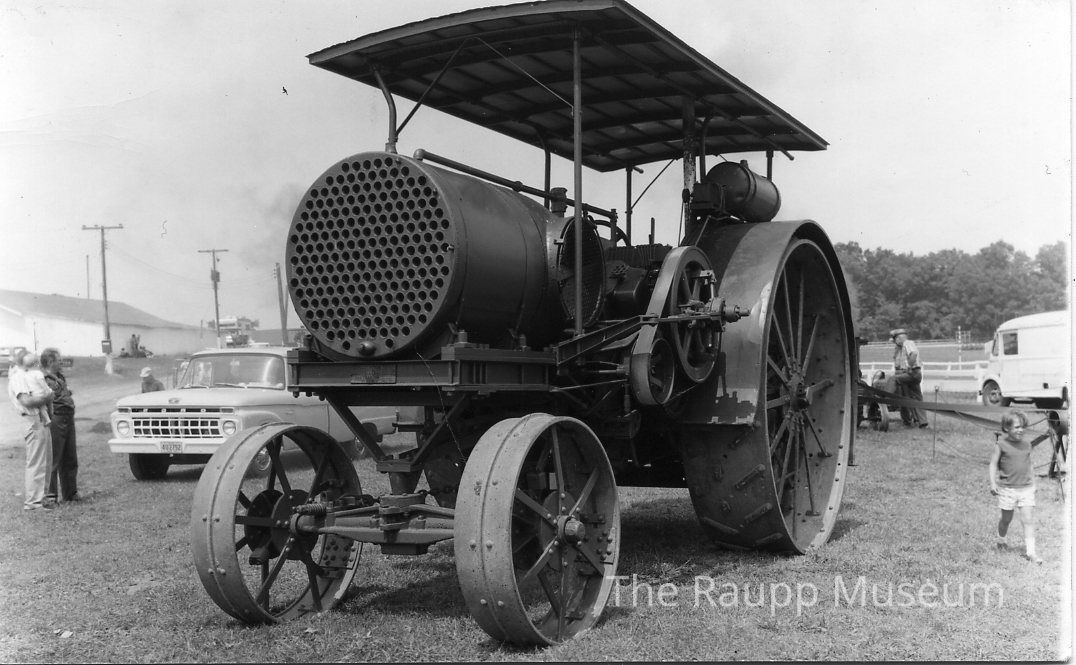 Black and white postcard print. Image of a front view of a vintage Aultman-Taylor tractor round perforated nose, large rear wheels and an open-air roof. Two men and child standing on the far left near a pickup truck with telephone poles in the background. reverse has postcard text. Handwritten ink text on reverse: "Ronald Bradley's engine when he threshed about 1933; Aug 1975."Dimensions