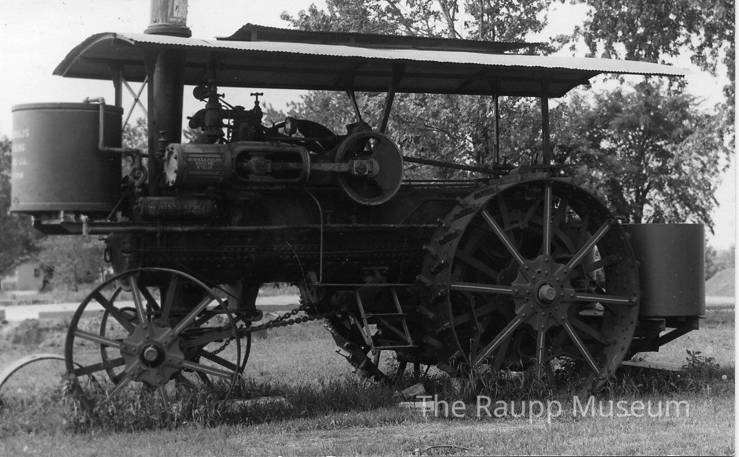 Black and white postcard print. Image of side view of a vintage 16 HP Minneapolis steam engine tractor with large rear wheels and an open-air roof. Round container on front and rear of the tractor. reverse has postcard text. Handwritten ink text on reverse: "Bill Understock engine for thrashing; Bill's was next size bigger about 1922; Aug 1975."Dimensions