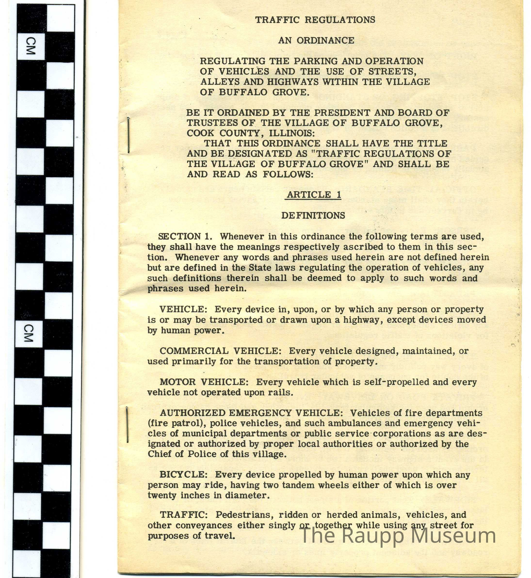Four leaves of tan paper with vertical center crease and staple binding. List of Buffalo Grove traffic ordinances from 1959 printed in black. Printed 9/9/1959 and ordinances effective 9/19/1959.Archive Details