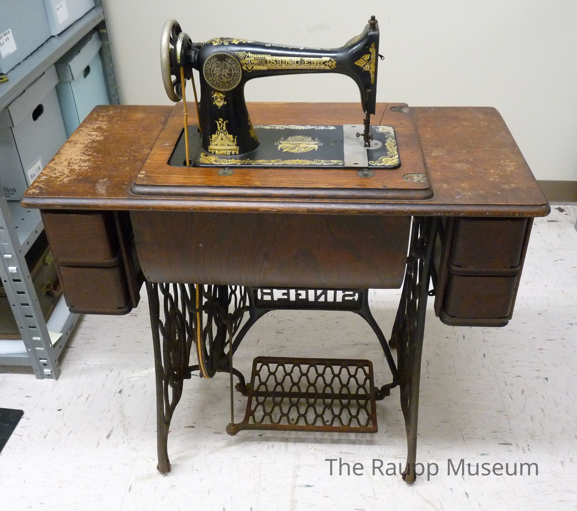 The wooden table has an extension piece that folds out to the left of the front. It can be detached by six screws. The wooden table that the sewing machine is attached to has two long wooden drawers on each side and a drawer that flips down in the front, to reveal three pockets to place supplies. The drawers have locks but the key is not with the donation. Some sewing supplies found in the bottom and top right drawers were separated into other plastic bags. The table underneath the machine has a rounded wooden container to hold the sewing machine when not in use. The legs are a heavy iron, with wheels on the bottom, and winding metal decorative designs on both sides. The wheel is on the right bottom side facing the front of the machine and to the left is a connecting bar with "SINGER" in metal between the bars. Underneath "SINGER" in the middle is a grated metal square pedal.