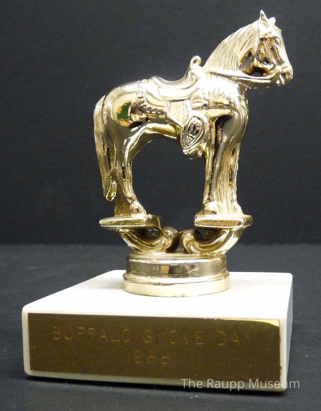 Cast metal horse mounted with screw to short, square marble base. Engraved text on brass plate: "Buffalo Grove Day, 1966." Plate secured to front of base. With four green felt feet on bottom of base.Dimensions
