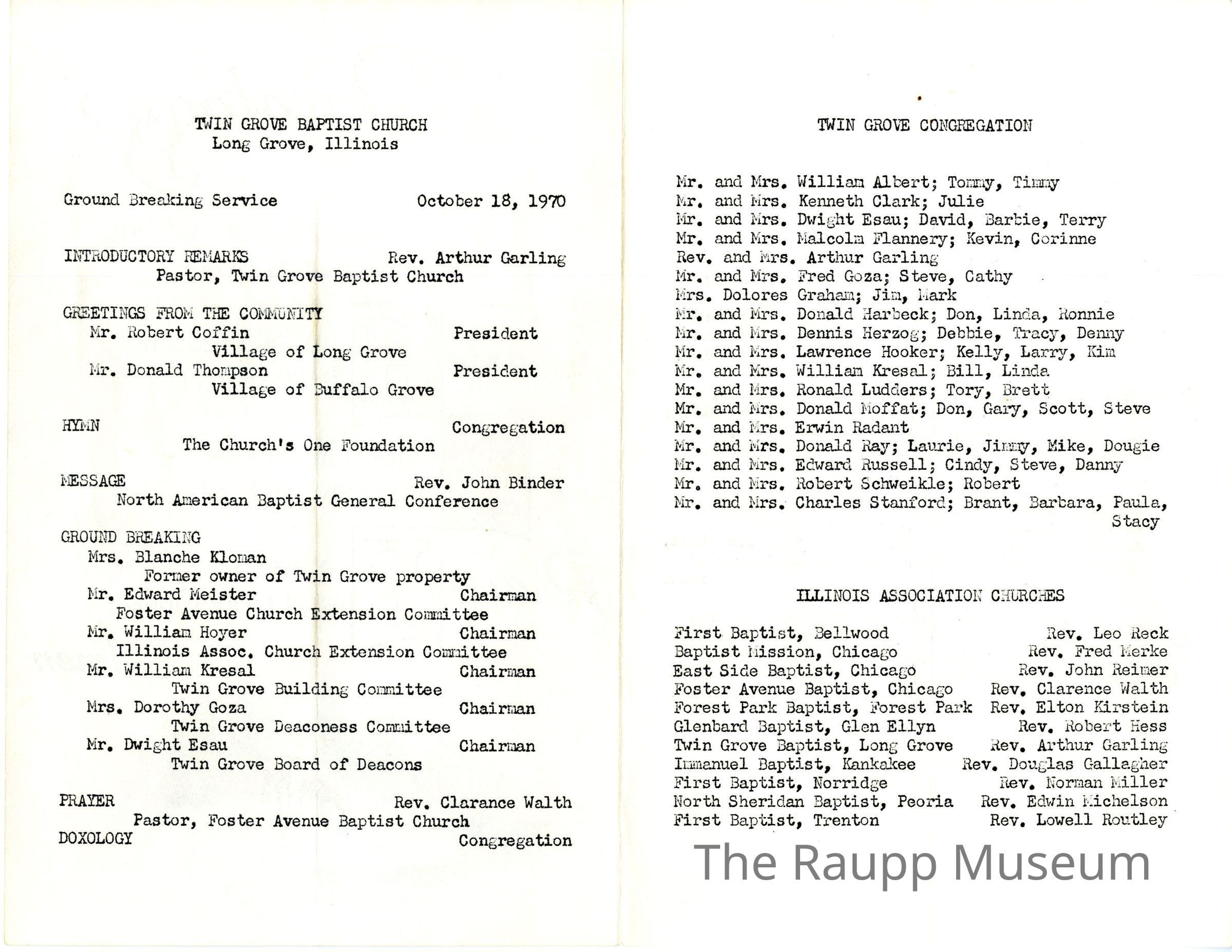 One (1) double-sided color program for Twin Grove Baptist Church groundbreaking ceremony. Program folds in the center, for 4-pages of programming. The cover is color with a Doxology written out, 4 verses, with embellished lettering, and a drawing of two deer in a lake with trees on the bottom. The inside 2 pages have a typed out program on the left, and members of the congregation and Illinois association churches on the right. On the back is typed "The Church's One Foundation" with 4 paragraphs of text.Archive Details