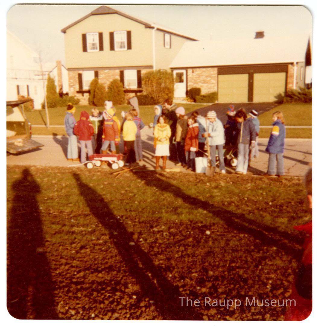 One (1) color photo of Girl Scout Troop 279 planting trees with adults in Twin Groves Park that they funded. Shows about 20 girls and adults with shovels and wagons waiting in the street at the park with a house behind them.Made/Created