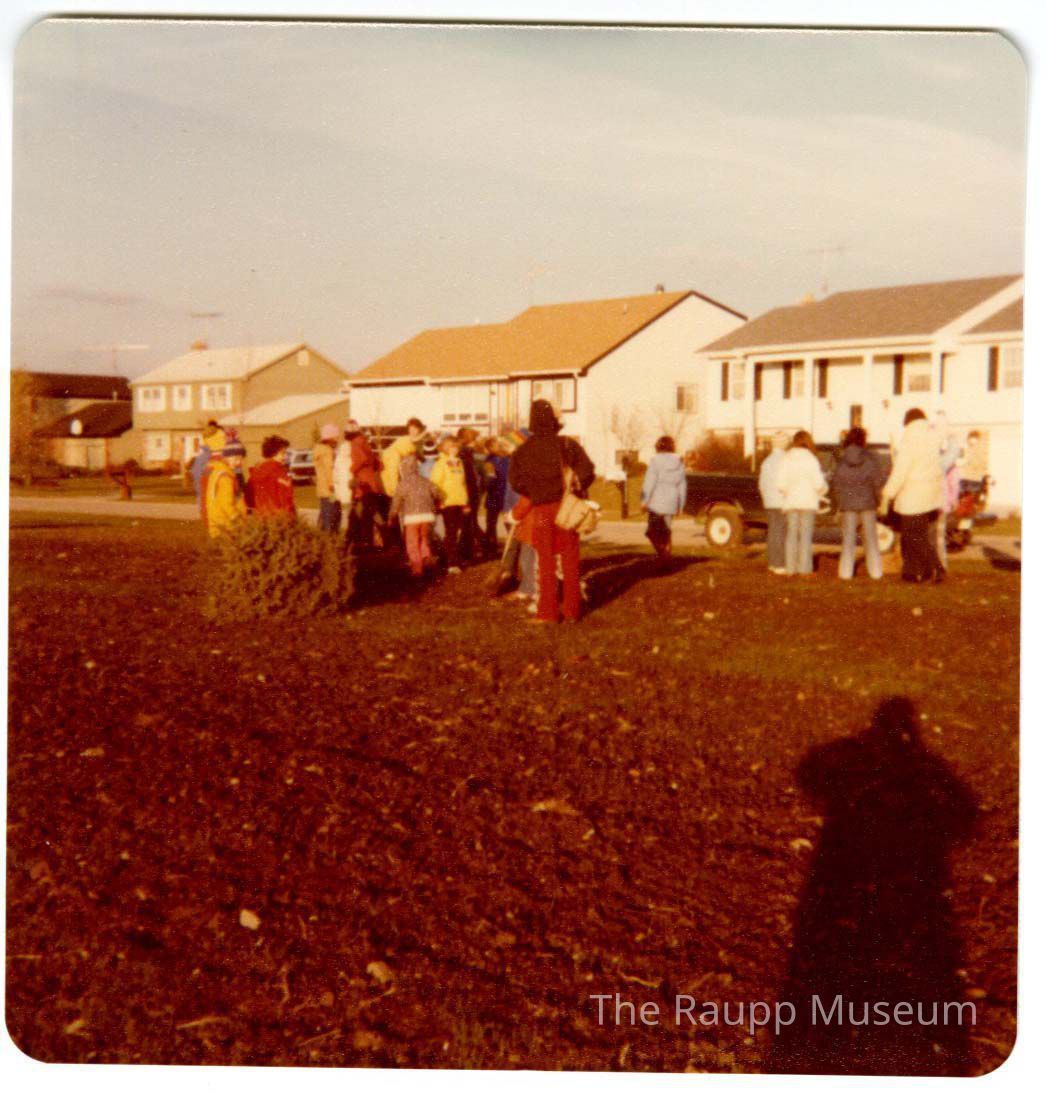 One (1) color photo of Girl Scout Troop 279 planting trees with adults in Twin Groves Park that they funded. Shows troop and adults looking towards the park district truck on the street, with a side ways spruce on the left side. Dirt in foreground.Made/Created