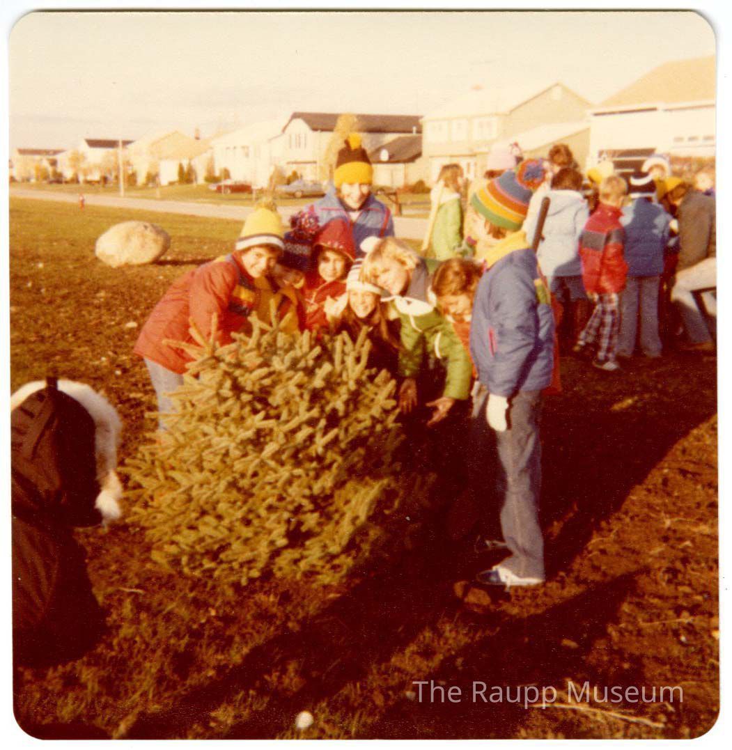One (1) color photo of Girl Scout Troop 279 planting trees with adults in Twin Groves Park that they funded. Shows 8 girls standing behind a spruce tree posing for a photo. There is another group with their backs behind them.Made/Created