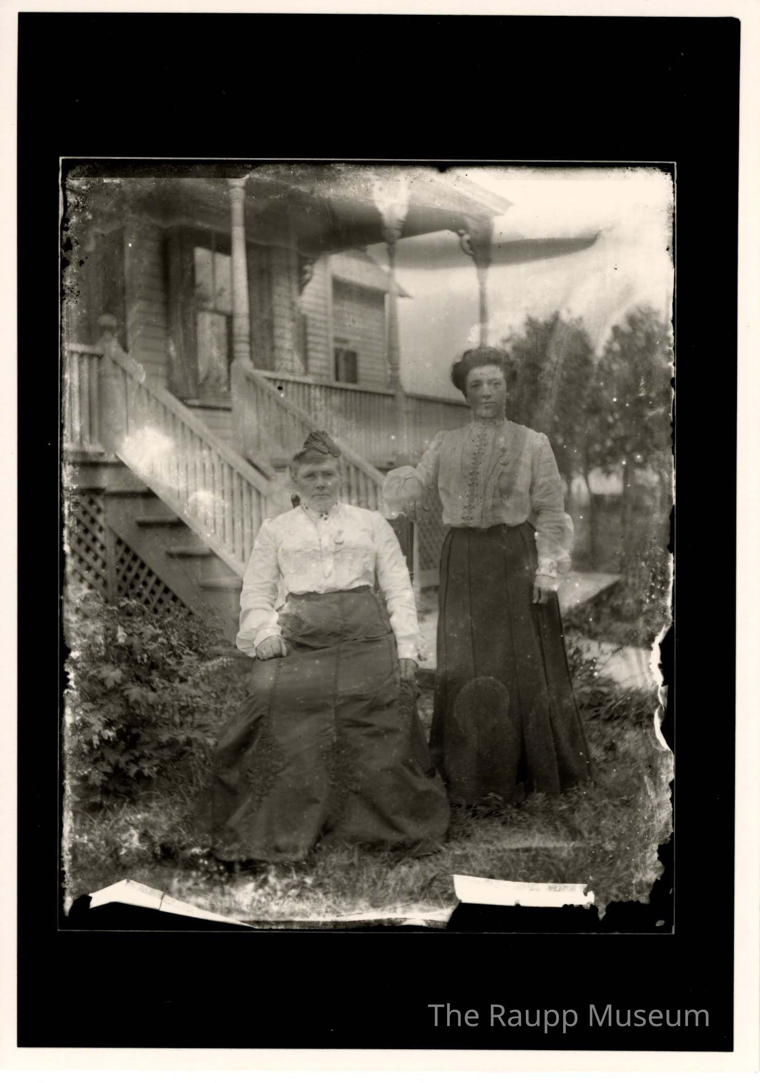 One (1) black and white photo taken from a glass negative. Photo shows two adult women standing outside a house. The women on the left is older and has a white button up shirt with grey skirt on and may be seated on the porch. The women on the right is younger and has a light colored ruffled top with grey skirt and has her left arm resting on something.
