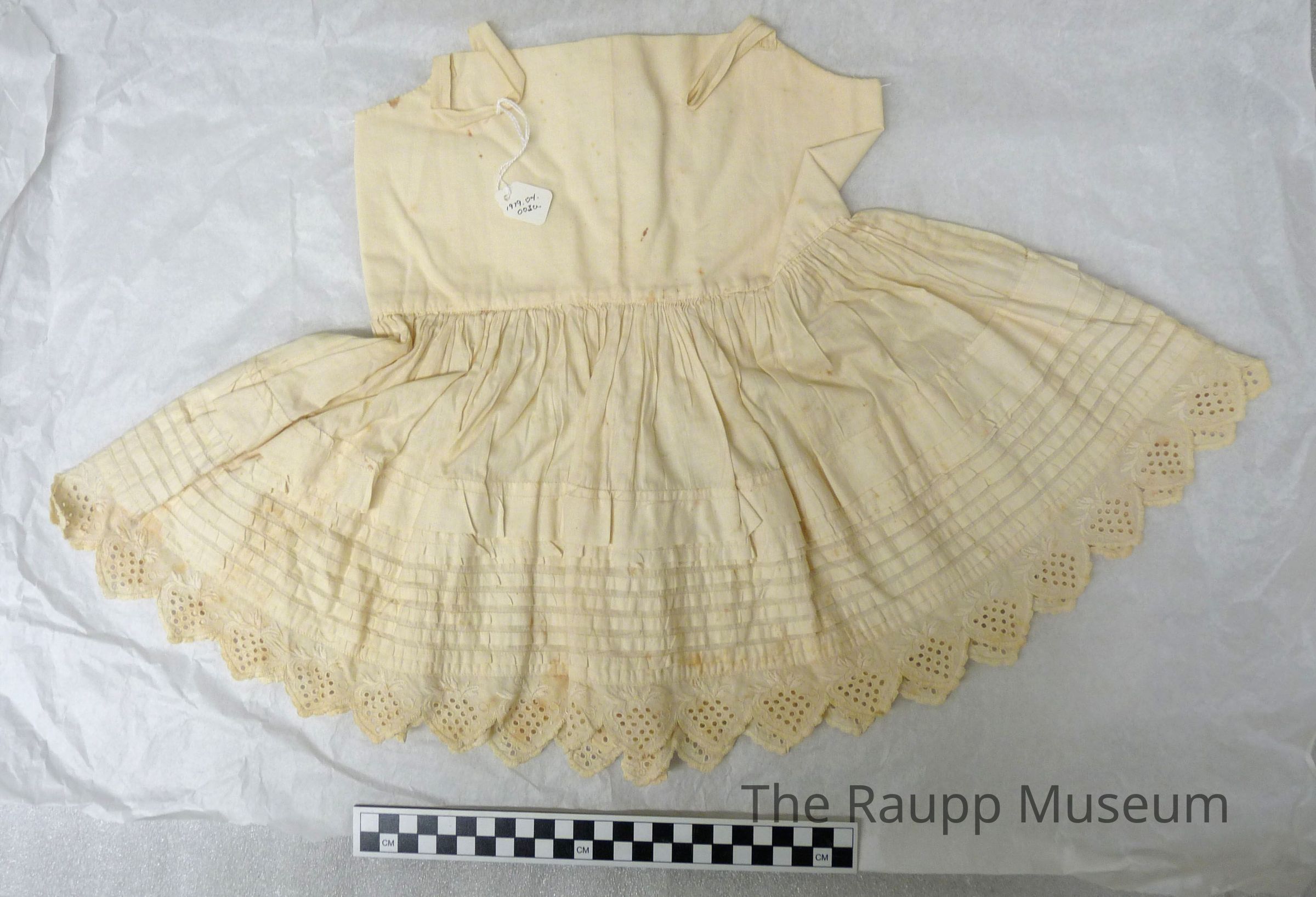 Off white Child's slip/jumper. Lingerie straps tucked at waist, 1" horizontal pleat and seven 1/4" pleats on lower skirt. Scalloped lace at bottom in strawberry design. Two buttons on back.