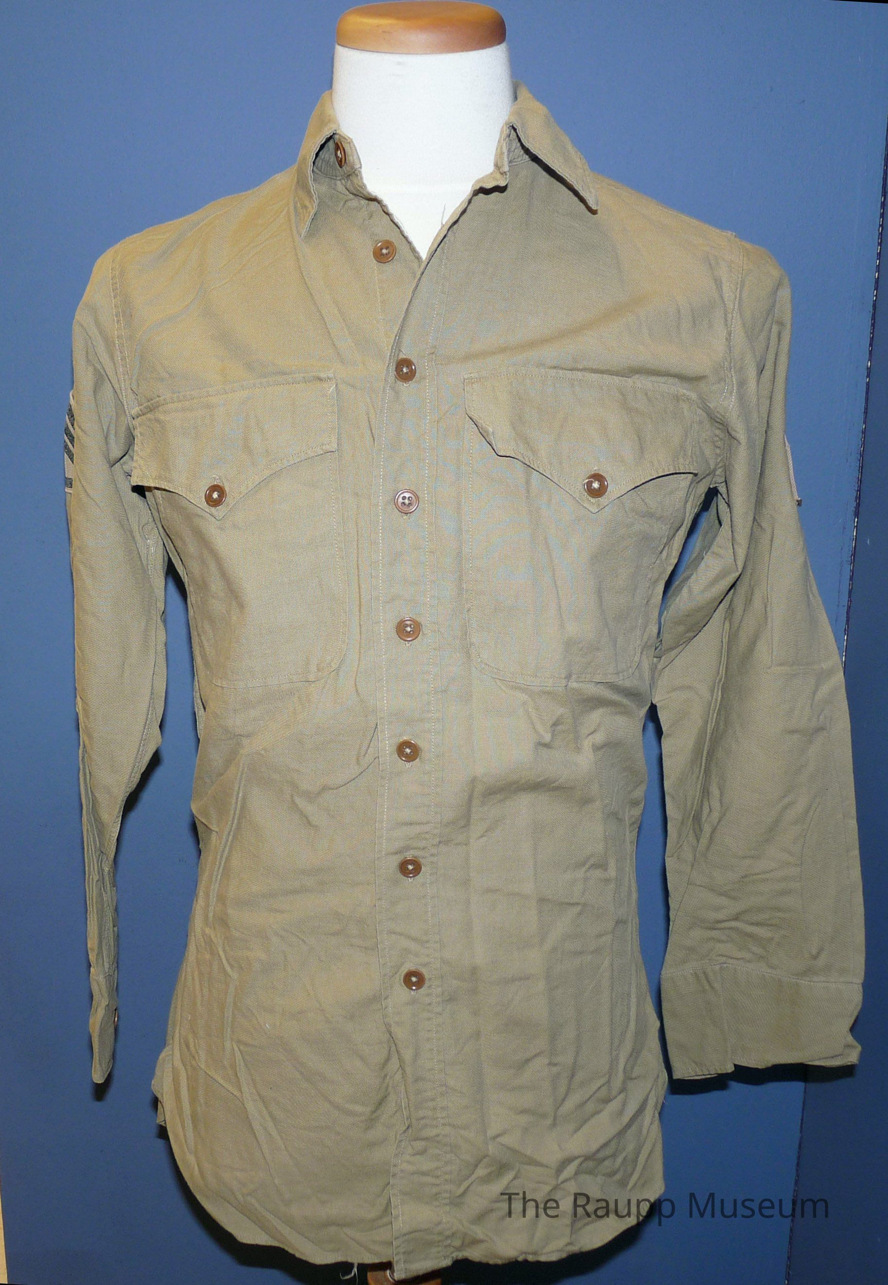 Long sleeve tan linen oxford shirt. Military issue. Shirt has two breast pockets, brown buttons, and black and white triangular arm patch with three chevrons (staff sergeant ranking) sewn to right sleeve.Relationships