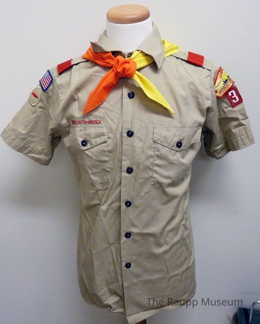 Boy Scout uniform shirt. Tan shirt with short sleeves and collar. Seven plastic button closures down the front and button closures on chest pockets. With red shoulder tabs and two patches on each sleeve. "Boy Scouts of America" embroidered in red thread above right pocket.Material
