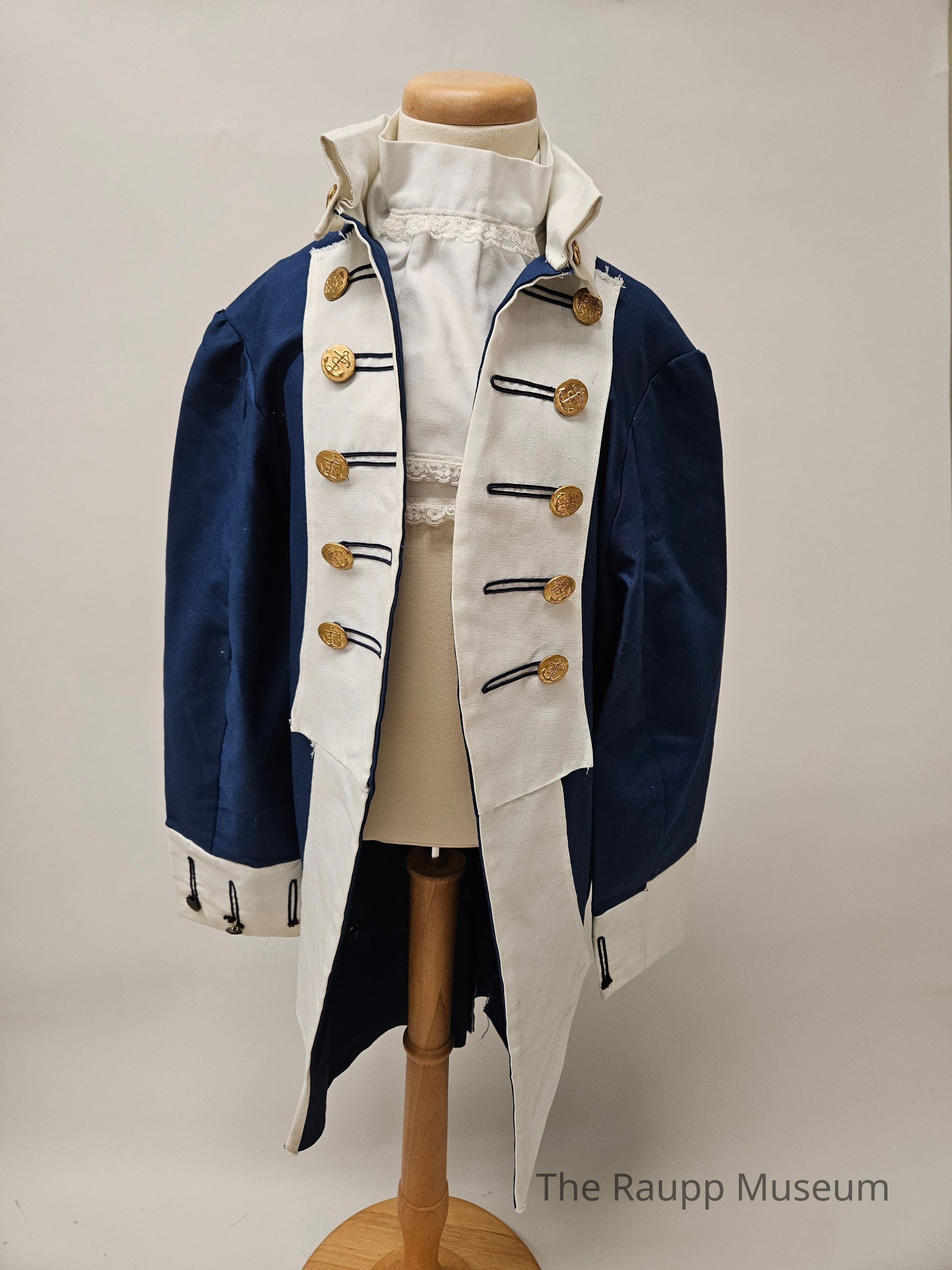 One (1) handmade union/American revolution soldier's costume for a child. Costume is a long blue coat with white lapel and collar. Lapels have 5 golden buttons on each side. There are two neckcloth or kerchiefs that attach around the neck with a metal loop/hook. Coat is not lined.Condition