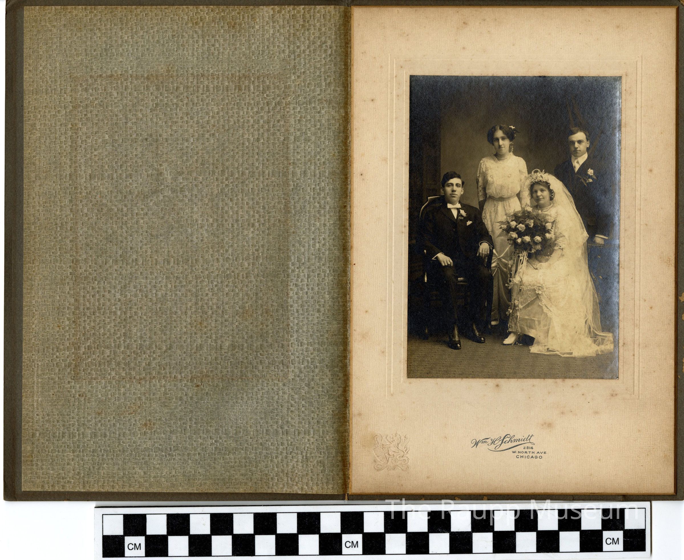 The photo is enclosed in a beige mat board frame with a blue printed label on the bottom: "Wm H Schmidt, 2814 W. North Ave., Chicago." There is an embossed lion and shield with cross design in the bottom left corner. There is a clear sheet over the photo to protect it, and the entire frame is enclosed in a dark brown mat board folder. On the front cover is an embossed design of a lion and scroll.