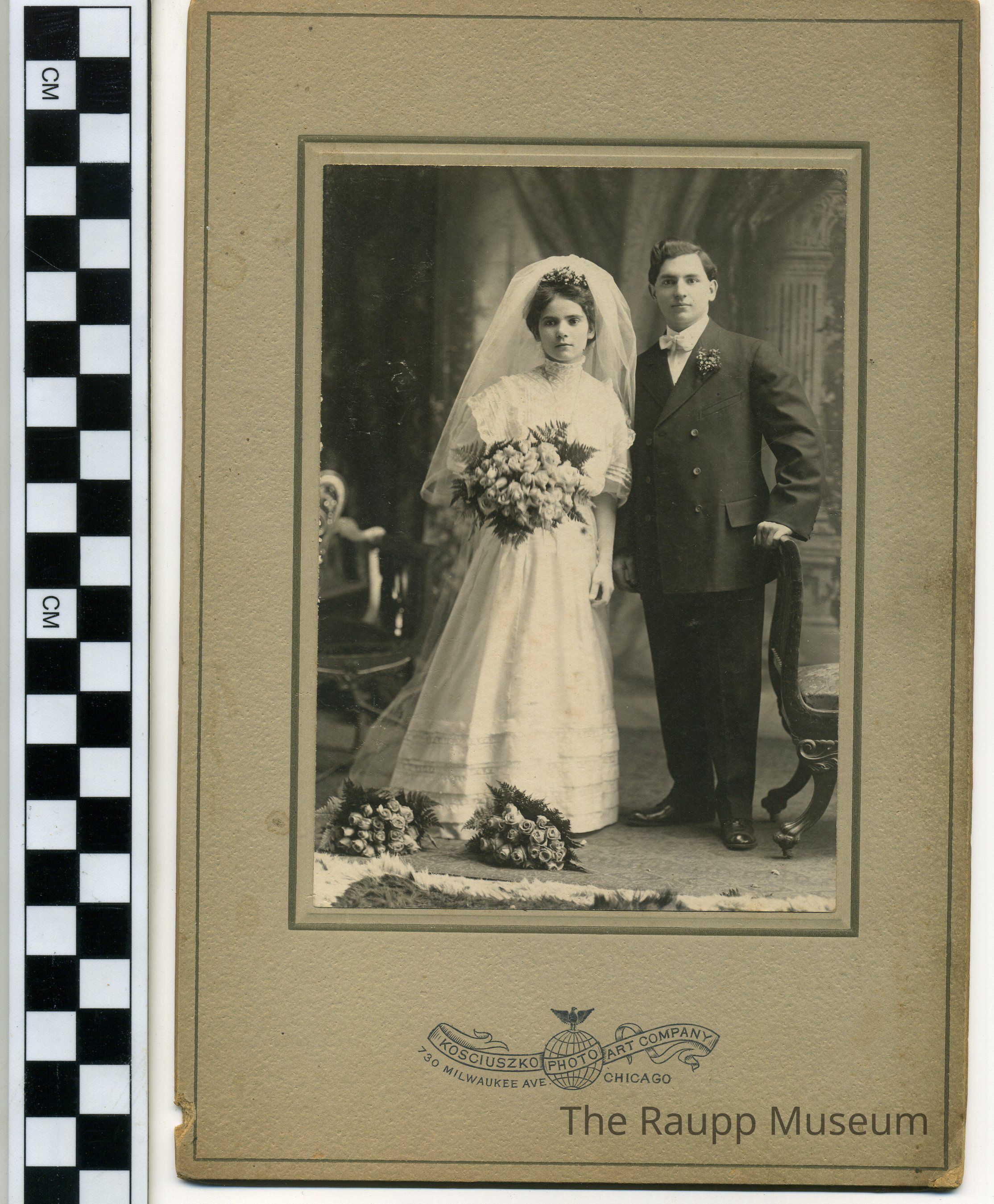 Black and white print mounted to a tan card with black border. Studio logo on mat below the image. Professional wedding portrait of unidentified couple. Woman is standing on left, wearing a large locket, white wedding dress with wide ruffled, lace yoke, puffed sleeves and tiered hem. She is holding a large bouquet of roses; two other bouquets at her feet. Studio backdrop with a window and column behind her. Man is standing on right with hand rest on on a chair. He is wearing a white bowtie and double-breasted suit.