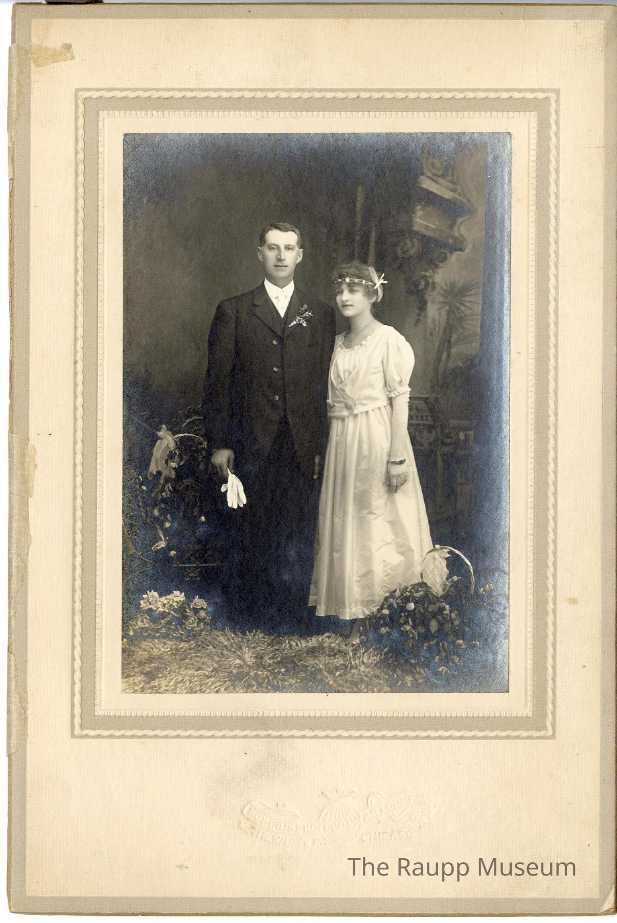 One (1) black and white professional photo. Image of a man and woman on their wedding day (?). Both individuals are standing next to each other, the woman on the mans left. The woman has a white dress on and white vest over the dress. She has a white band hairpiece tied around her forehead. She has on a bracelet on her left arm. The man is wearing a black 3-piece suit and white undershirt and white tie. He has a boutonniere on his left breast pocket. The man is holding a pair of white gloves. There is a rug and baskets of flowers on each side of the couple. There is a decorative archway design in the background.Dimensions