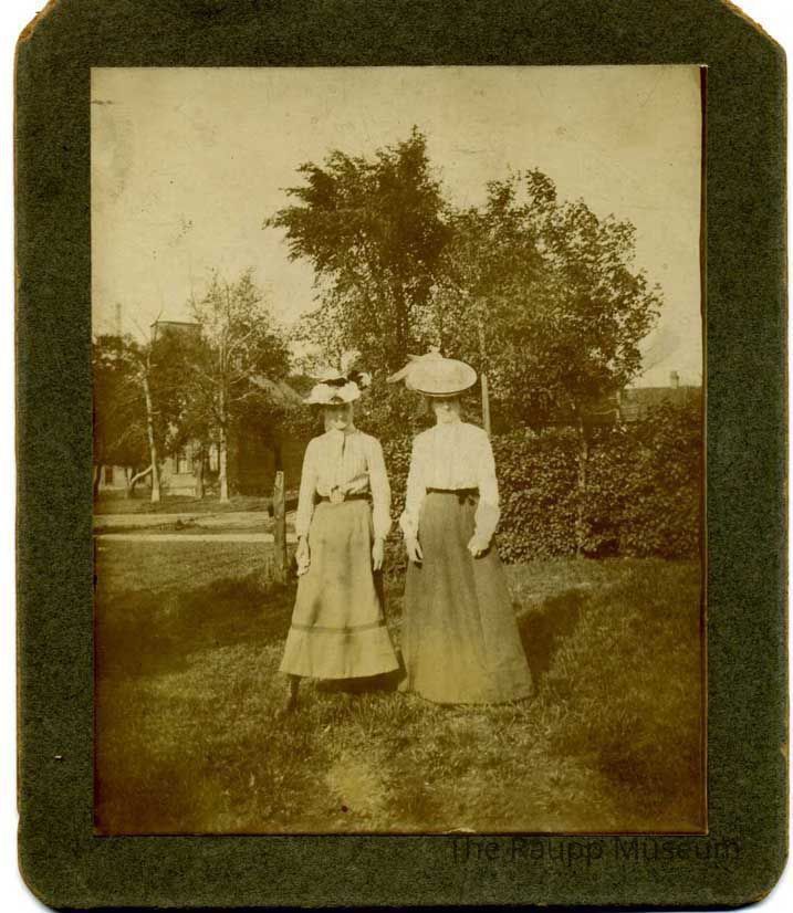 Black and white print turned yellow mounted on a heavy gray textured cardstock with rounded edges. Image of two women standing in grass in front of some bushes and a fence. The one on the left is wearing a small floral hat, striped long- sleeved shirt tucked into an ankle-length, belted bell-shaped skirt. The woman on the right is wearing a large brimmed hat, long-sleeve white blouse tucked into a long belted skirt.