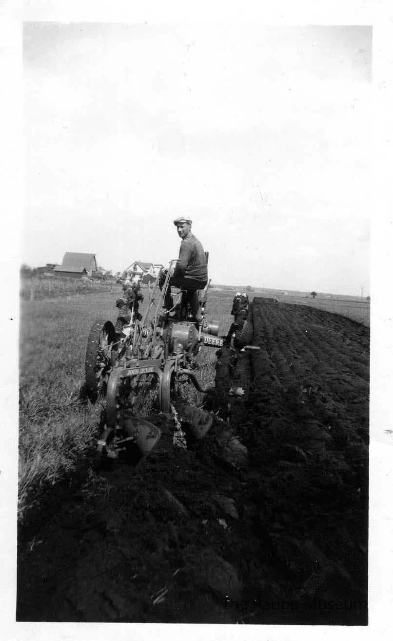 Black and white print with white border. Image of Urban Welter driving a tractor in a field. He is partially turned around to look at the camera and wearing a long sleeve shirt, hat and trousers. The soil on the right side of the image is black. A farmhouse and barn in the background on the left side.Relationships