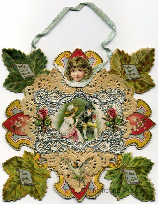 Valentine greeting card. Layered paper appliques create a symmetrical shape with four tri-leaf corners around an embossed lace diamond shape center with scalloped corners. Card has printed lithograph colors. Blue ribbon attached to upper leaves for hanging the card.