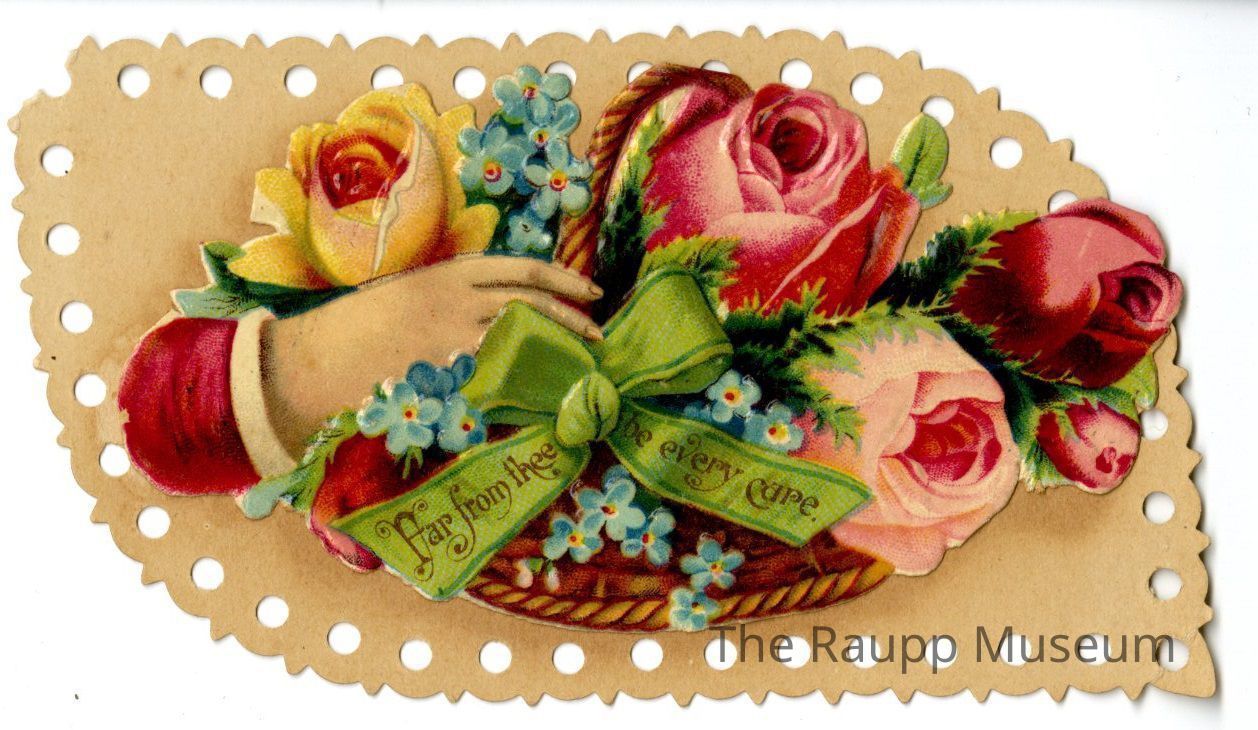 One (1) multicolored cardboard valentine card. Card has a brown cardboard background with zig-zag edges cut out circles along the border. It is rounded on two ends and pointed on two ends. On top is a smaller card (attached at the left side but has since fallen off) that features a hand holding onto a basket with a handle. Inside the basket are red and yellow roses with blue flowers and leaves. Attached at the front is a green bow with "Far from thee be every care" printed on it. This opens on the right to reveal "Isidor G. Nickol" printed underneath.Relationships